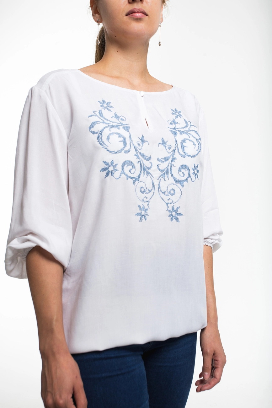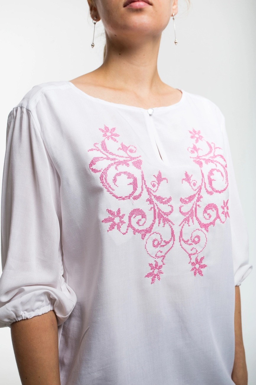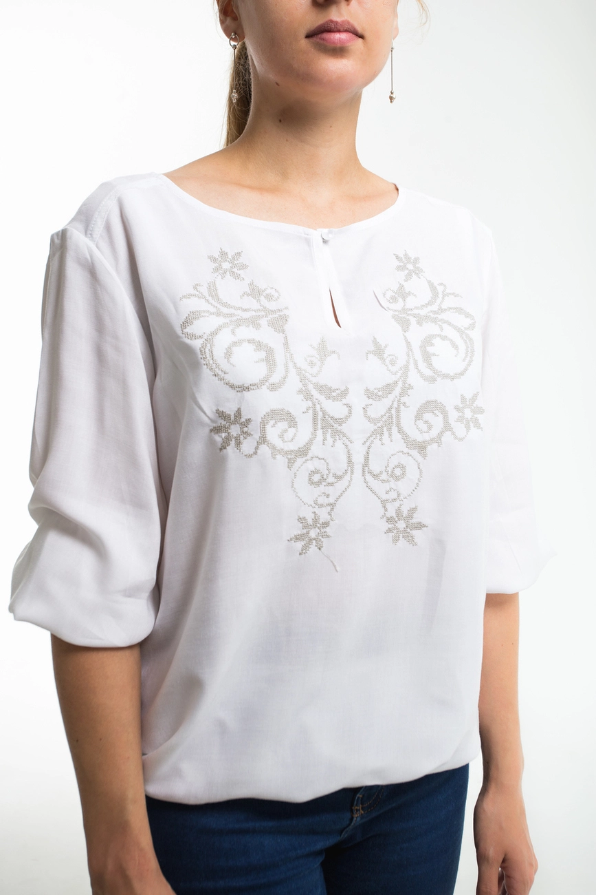 Жіноча блуза з вишивкою на білому фоні від гуртівні Leosouvenir має багатий та святковий вигляд.