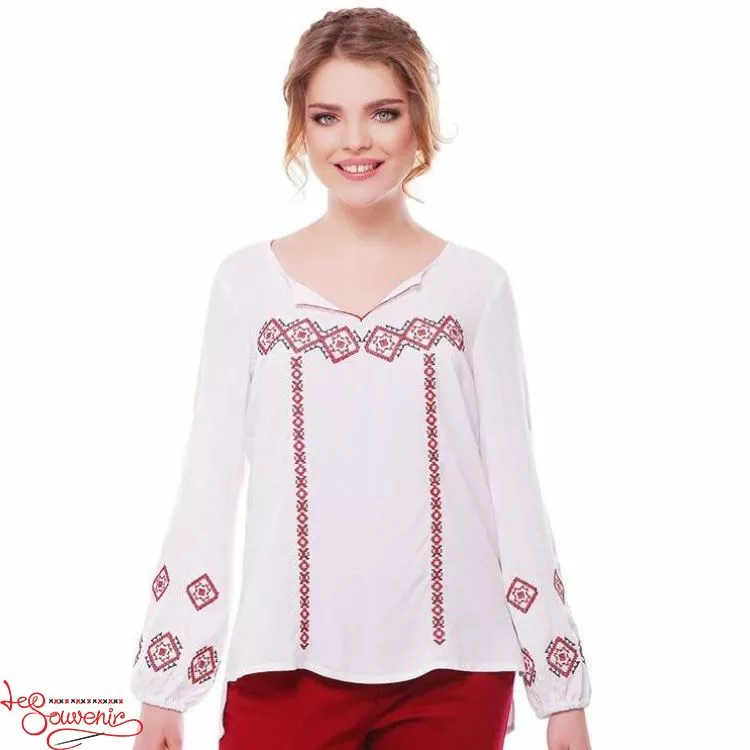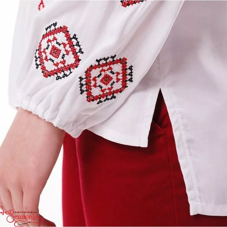 Жіноча блуза з яскраво-червоною вишивкою на білому фоні від гуртівні Leosouvenir має багатий та святковий вигляд.