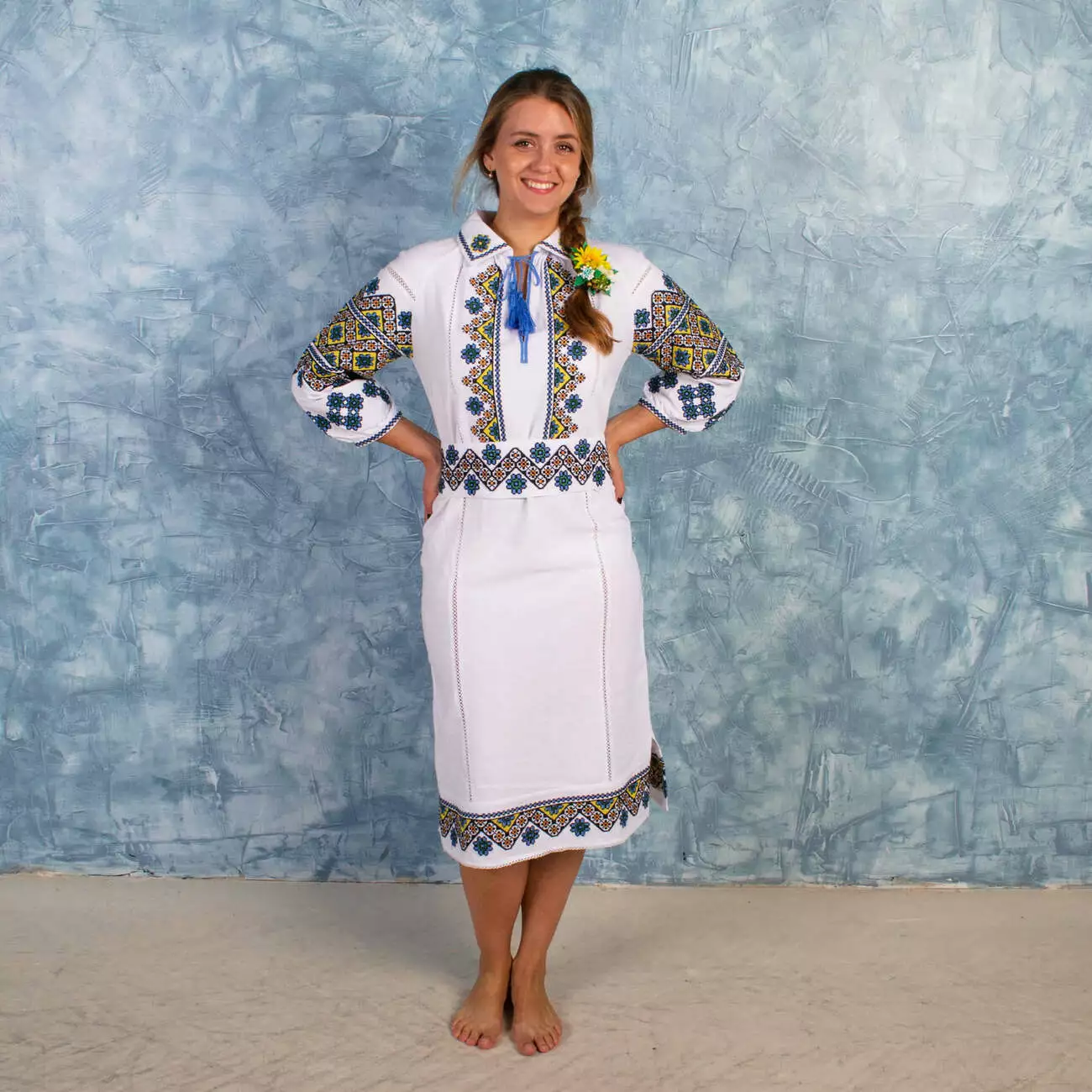 Жіноча сукня, чудово виконана на делікатній тканині із оригінальним орнаментом нитками яскравих кольорів, від гуртівні Leosouvenir чудово підкреслить Ваш неперевершений смак і стиль.