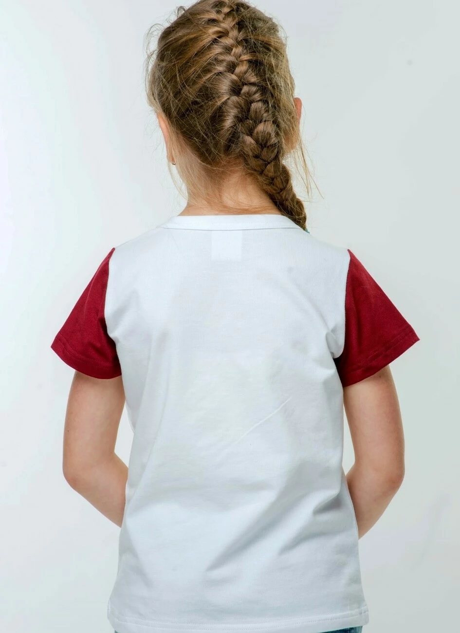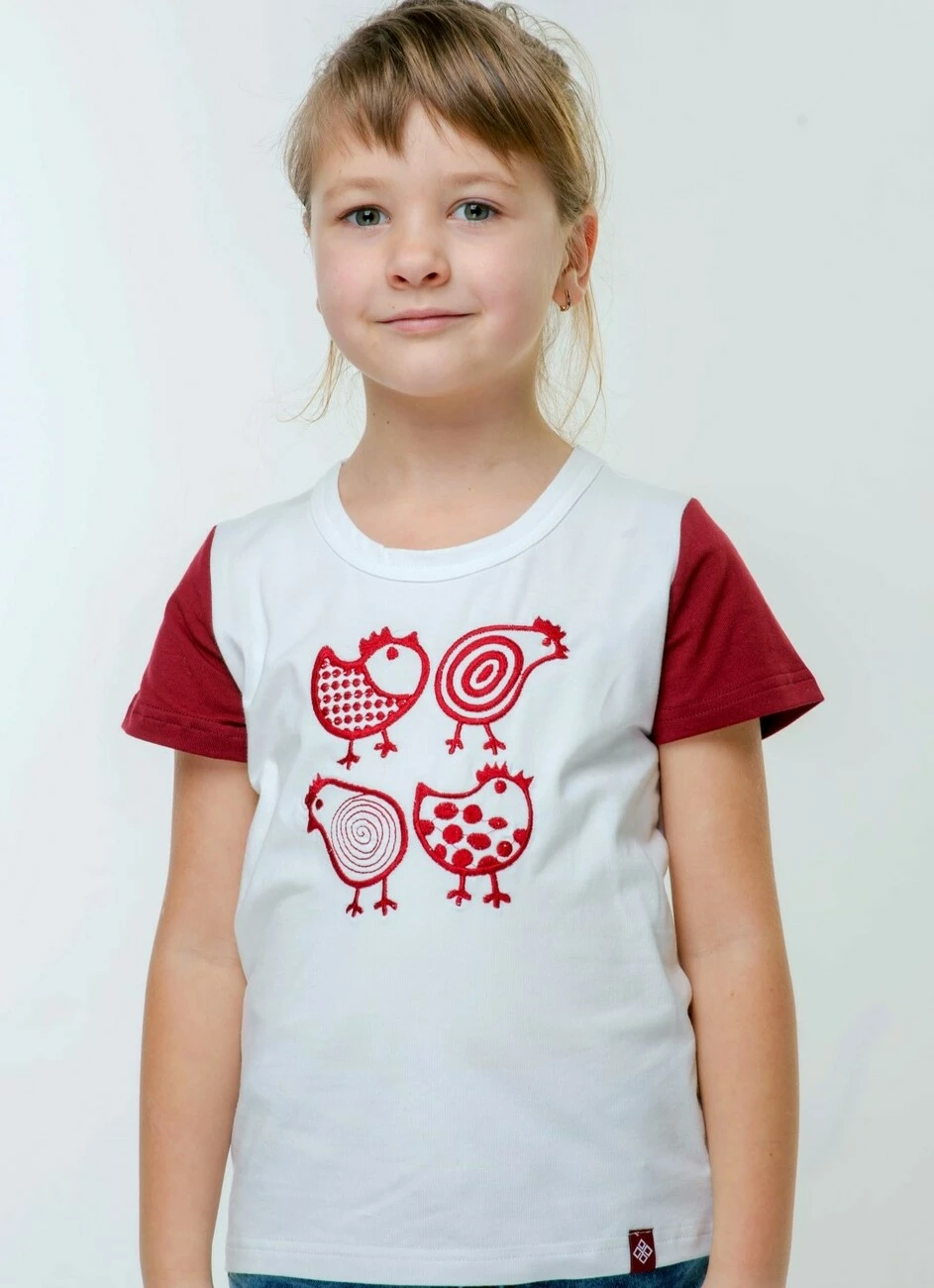 Дитяча футболка із вишивкою червоного кольору гладдю, яка чудово контрастує із білою тканиною футболки, від гуртівні Leosouvenir неабияк потішить Вашу малечу.