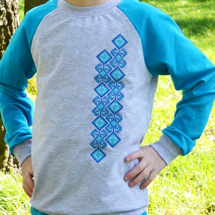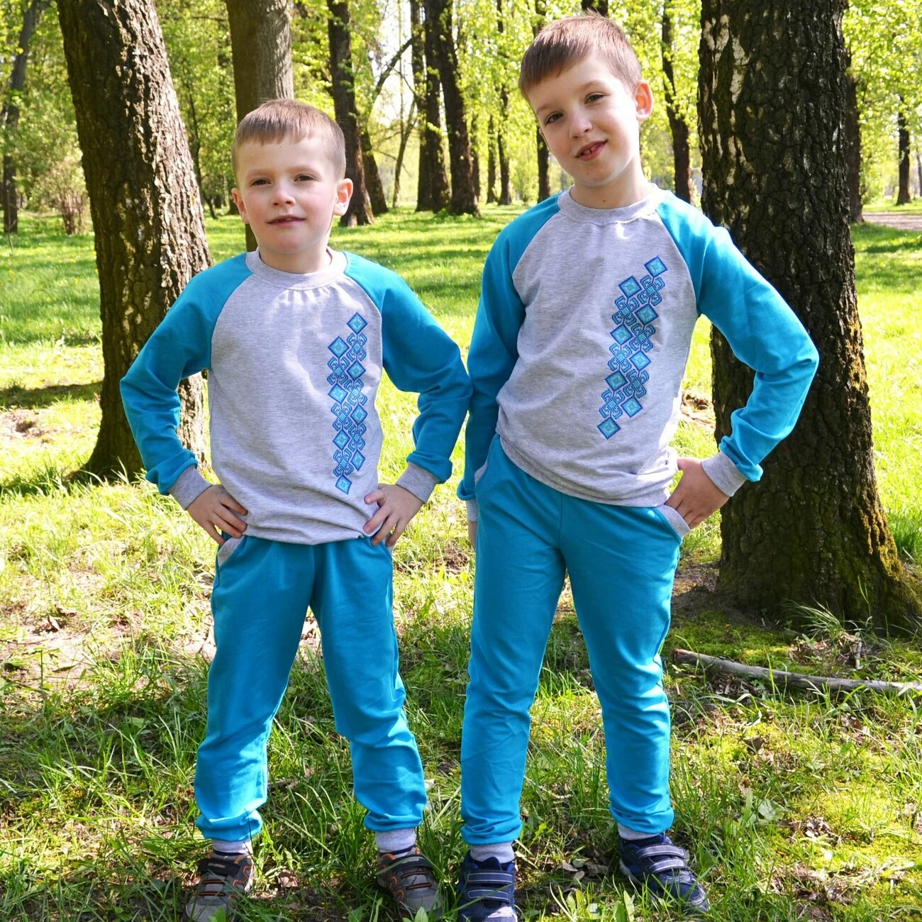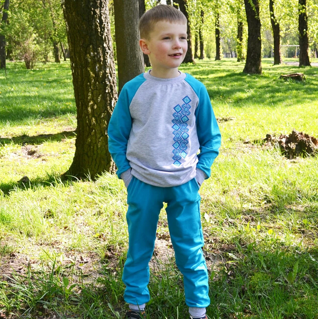Дитячий блакитно-сірий спортивний костюм із вишитим візерунком від гуртівні Leosouvenir чудово пасуватиме Вашій малечі.