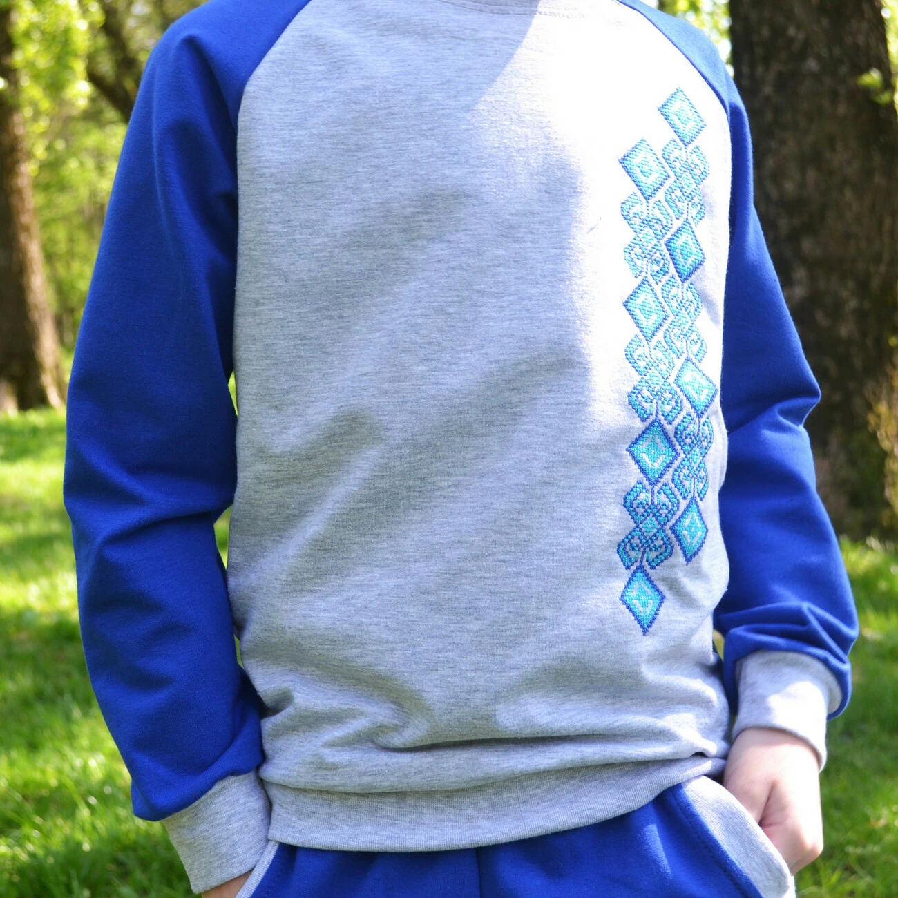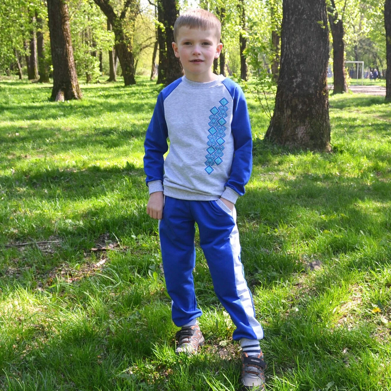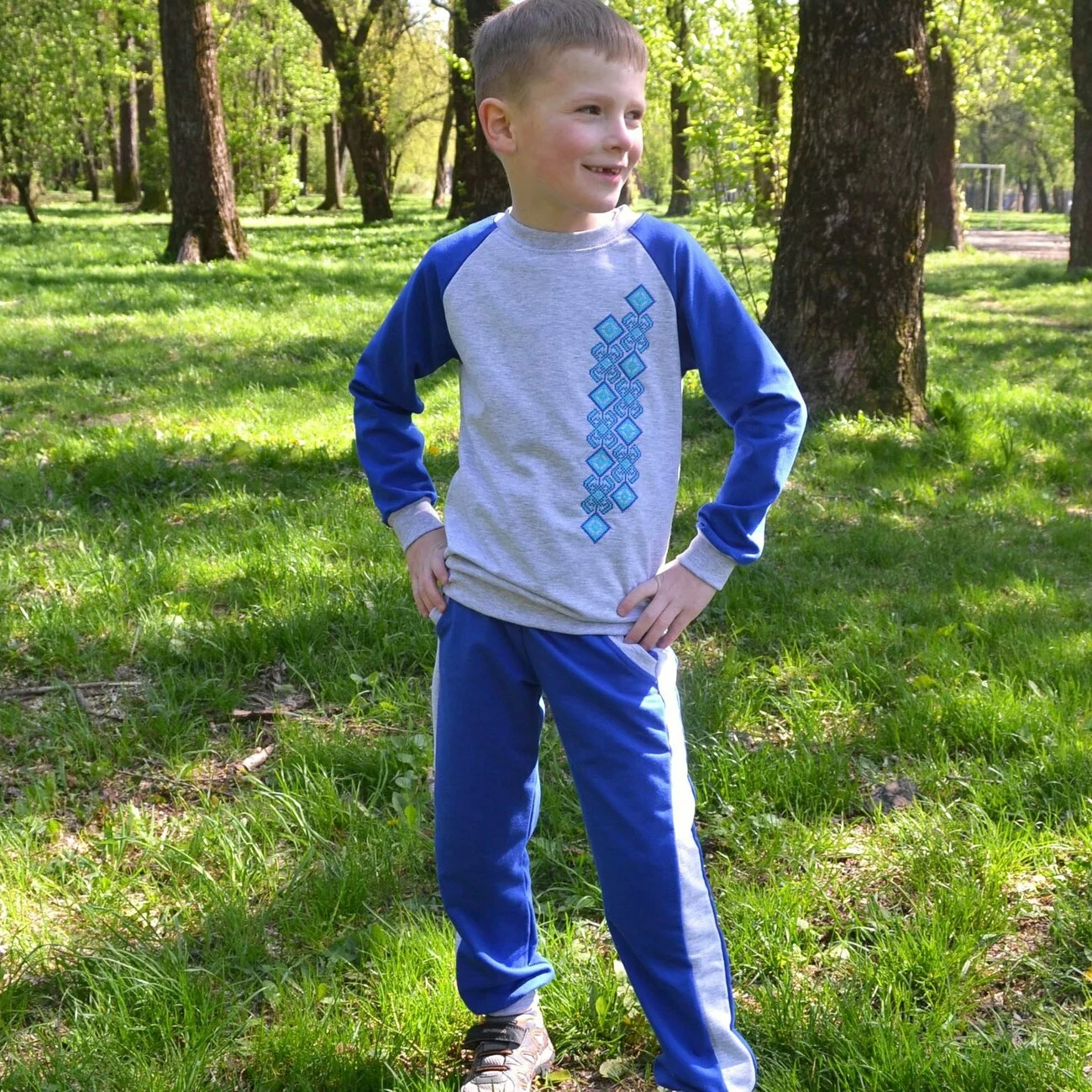 Дитячий синьо-сірий спортивний костюм із вишитим візерунком від гуртівні Leosouvenir чудово пасуватиме Вашій малечі.