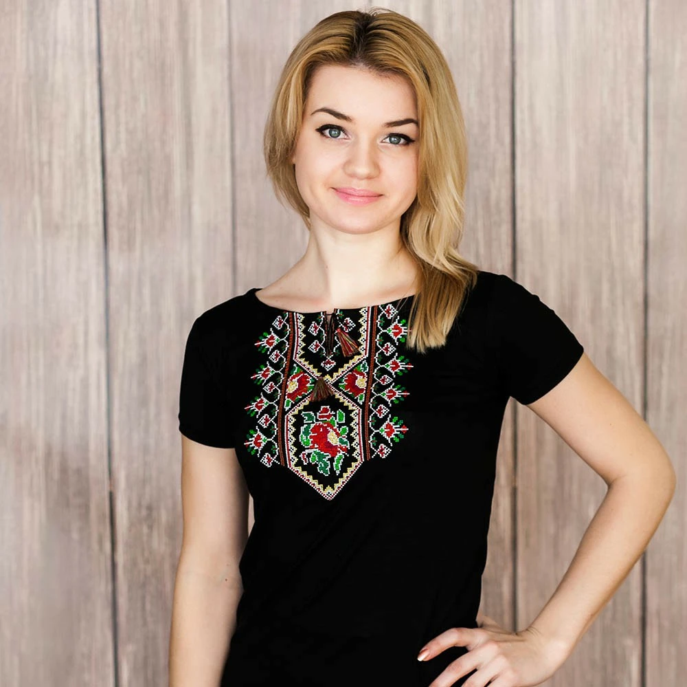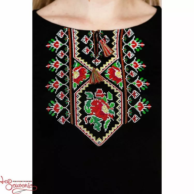 Жіноча вишита футболка оздоблена яскравим широким багатим орнаментом на чорному тлі від гуртівні Leosouvenir чудово підкреслить Ваш неперевершений смак і стиль.