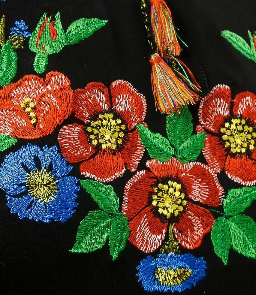 Жіноча вишита футболка оздоблена яскравим букетом квітів на чорному тлі від гуртівні Leosouvenir чудово підкреслить Ваш неперевершений смак і стиль.
