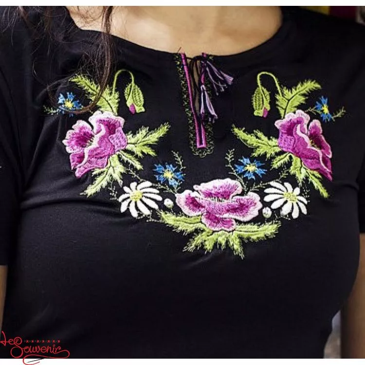Жіноча вишита футболка оздоблена класичною вишивкою гладдю на чорному тлі від гуртівні Leosouvenir чудово підкреслить Ваш неперевершений смак і стиль.