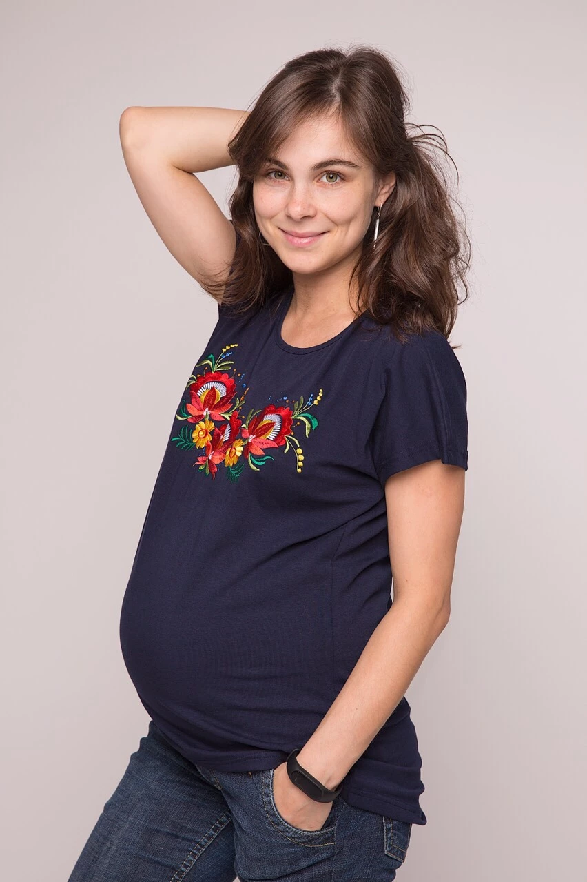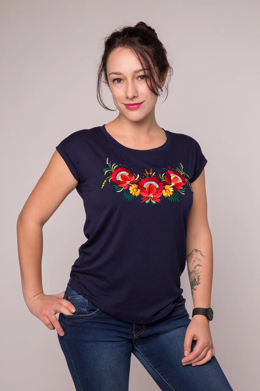 Жіноча вишита футболка оздоблена букетом квітів яскравих кольорів на синьому тлі від гуртівні Leosouvenir чудово підкреслить Ваш неперевершений смак і стиль.