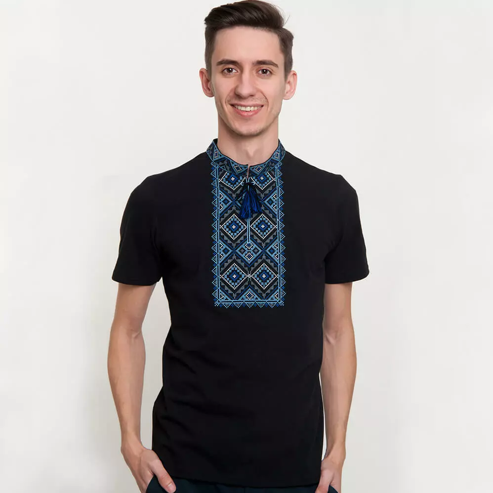 Чоловіча вишита футболка оздоблена вишивкою синього кольору на чорному тлі від гуртівні Leosouvenir чудово підкреслить Ваш неперевершений смак і стиль.