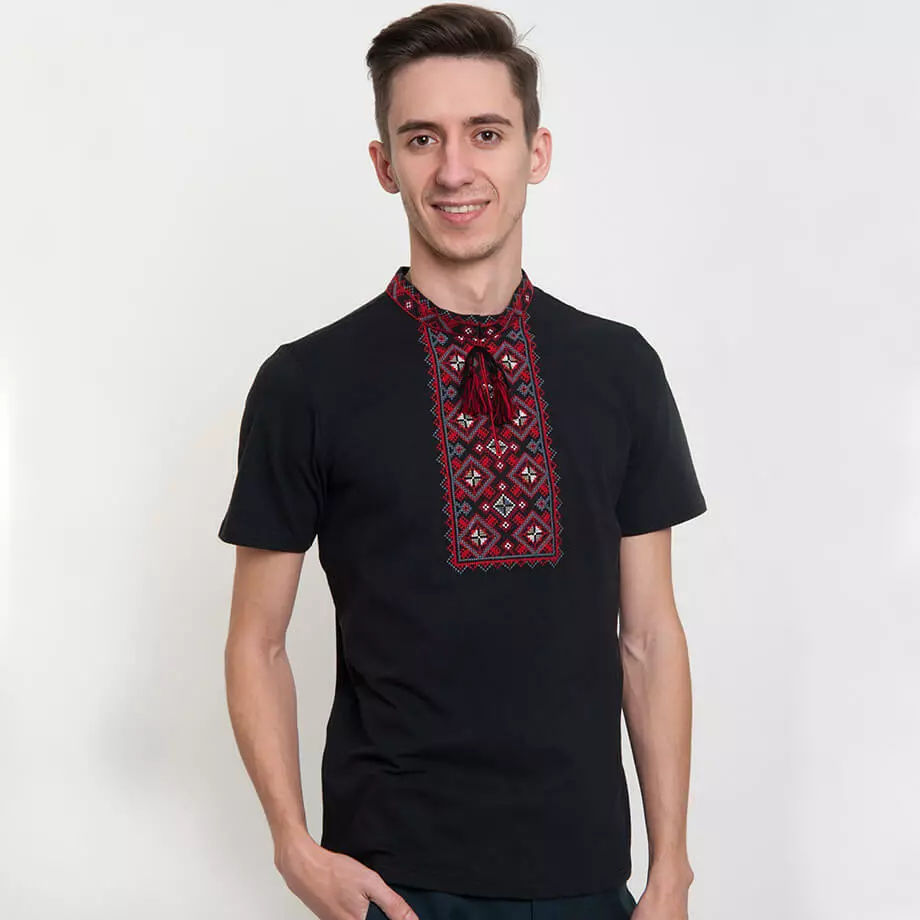 Чоловіча вишита футболка оздоблена вишивкою червоного кольору на чорному тлі від гуртівні Leosouvenir чудово підкреслить Ваш неперевершений смак і стиль.