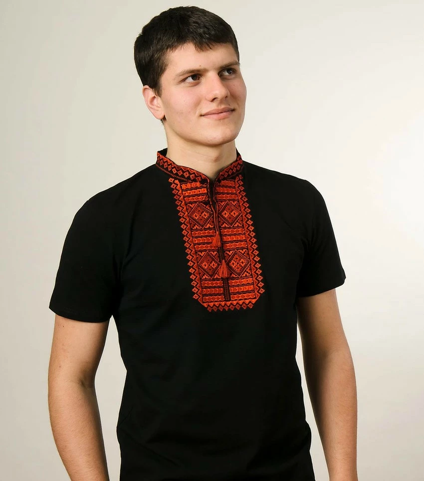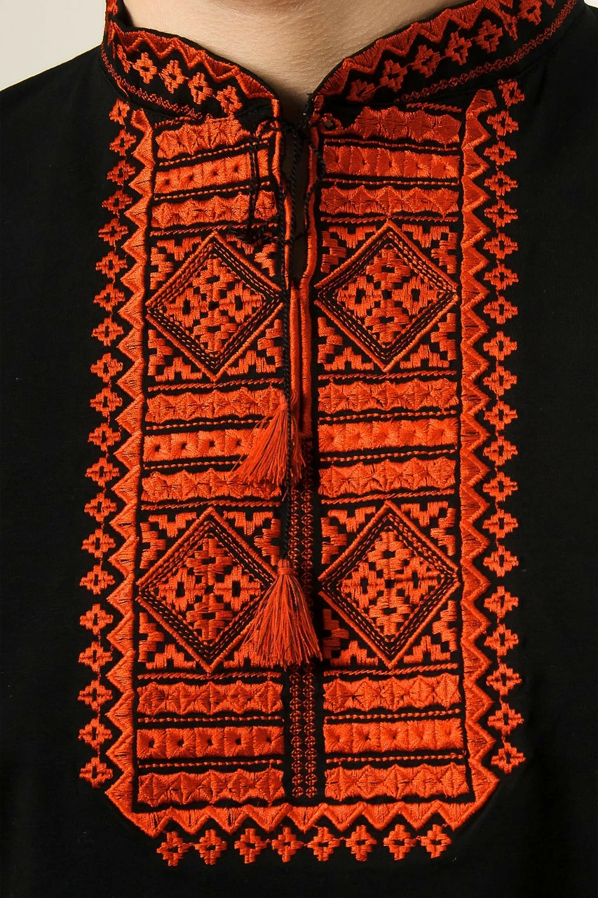 Чоловіча вишита футболка оздоблена вишивкою яскравих кольору на чорному тлі від гуртівні Leosouvenir чудово підкреслить Ваш неперевершений смак і стиль.