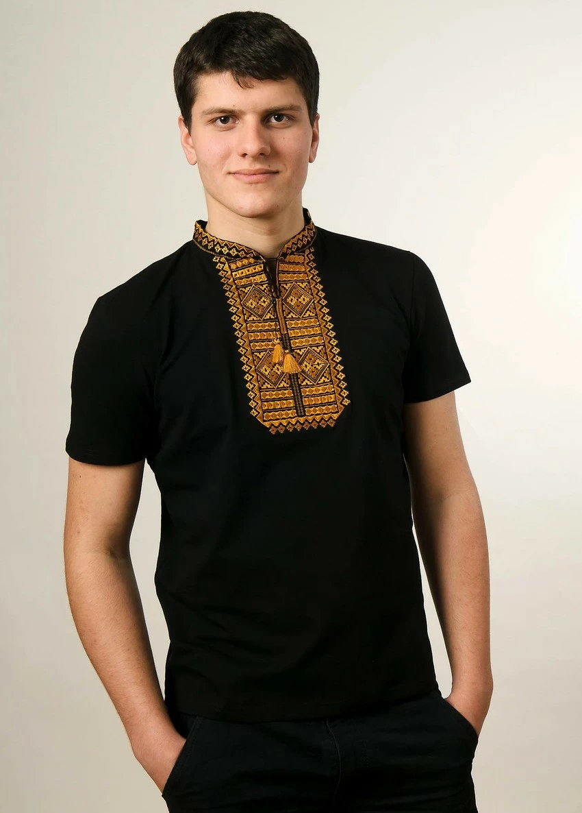 Чоловіча вишита футболка оздоблена вишивкою яскравих кольору на чорному тлі від гуртівні Leosouvenir чудово підкреслить Ваш неперевершений смак і стиль.