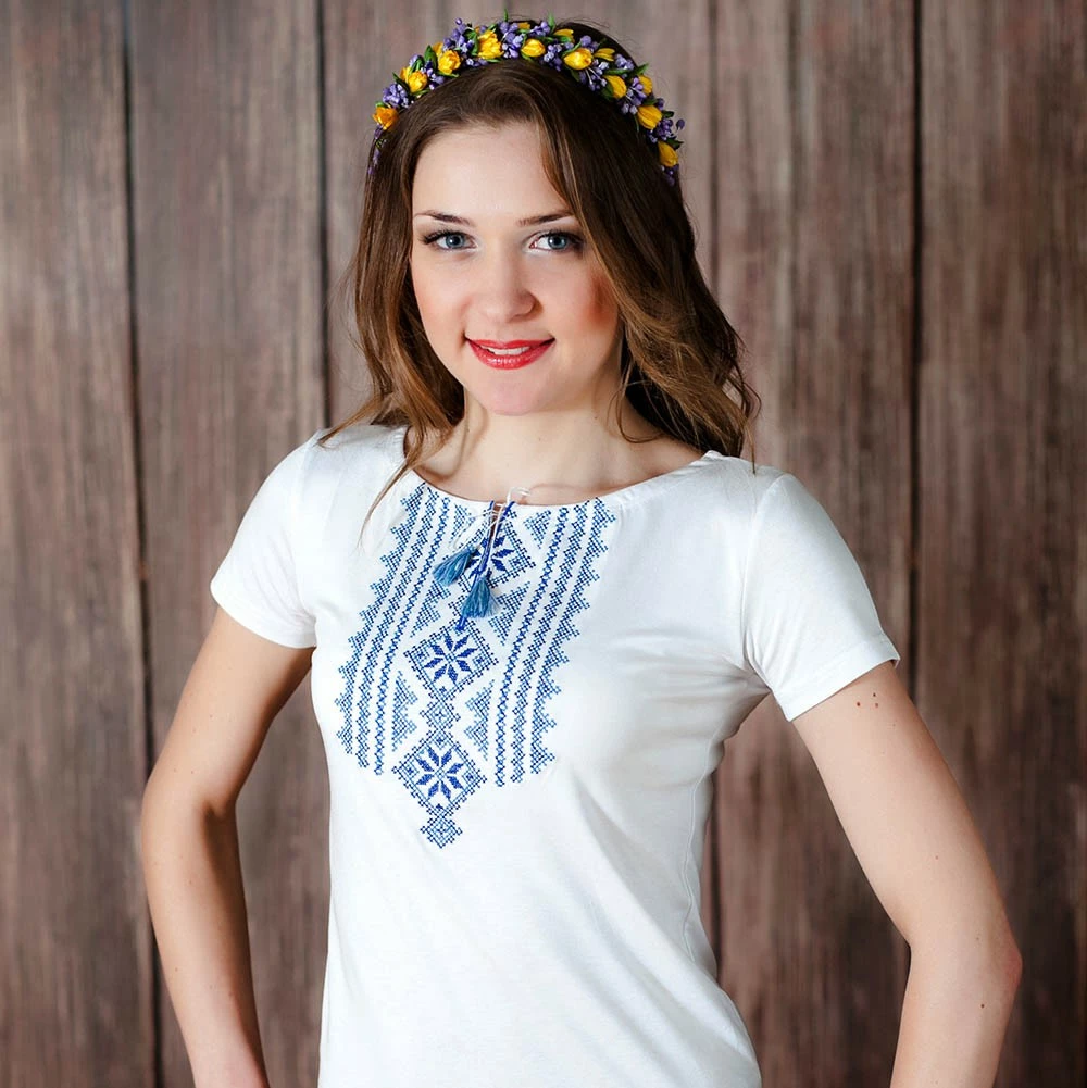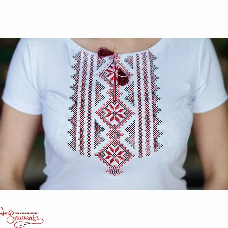 Жіноча вишита футболка оздоблена яскравим орнаментом на білому тлі від гуртівні Leosouvenir чудово підкреслить Ваш неперевершений смак і стиль.