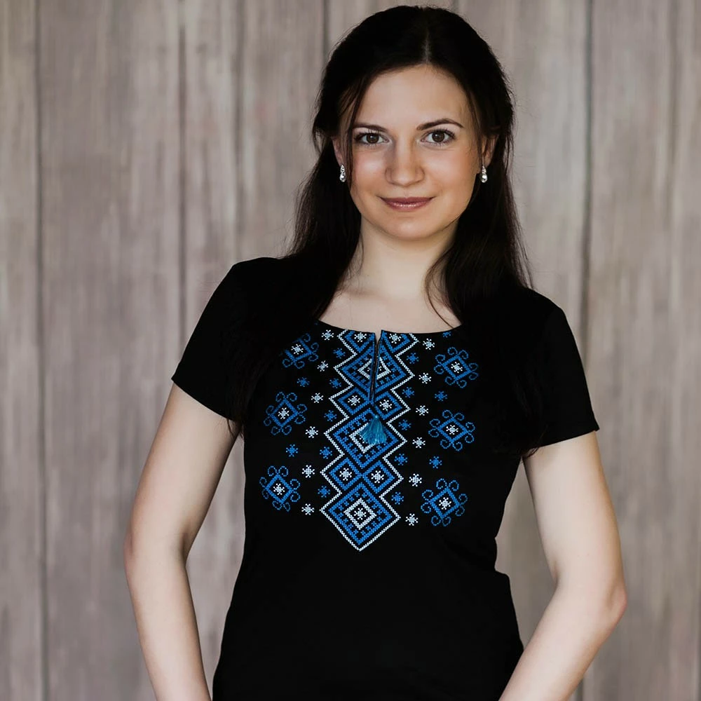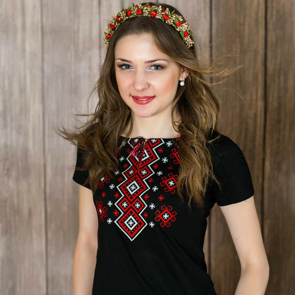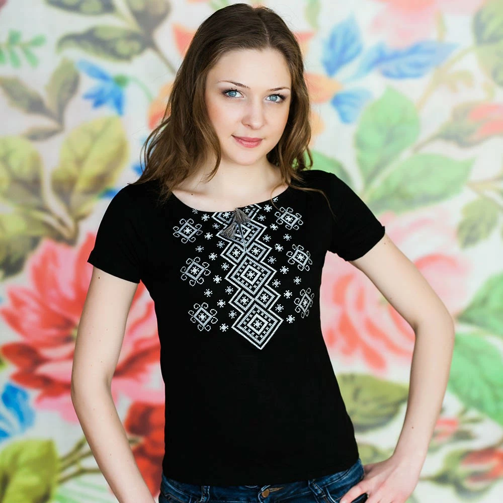 Жіноча вишита футболка оздоблена яскравим широким орнаментом на чорному тлі від гуртівні Leosouvenir чудово підкреслить Ваш неперевершений смак і стиль.