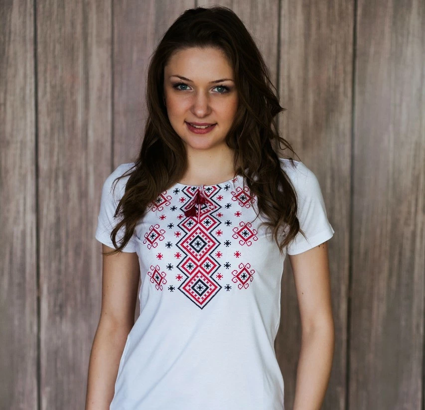 Жіноча вишита футболка оздоблена яскравим широким орнаментом на білому тлі від гуртівні Leosouvenir чудово підкреслить Ваш неперевершений смак і стиль.