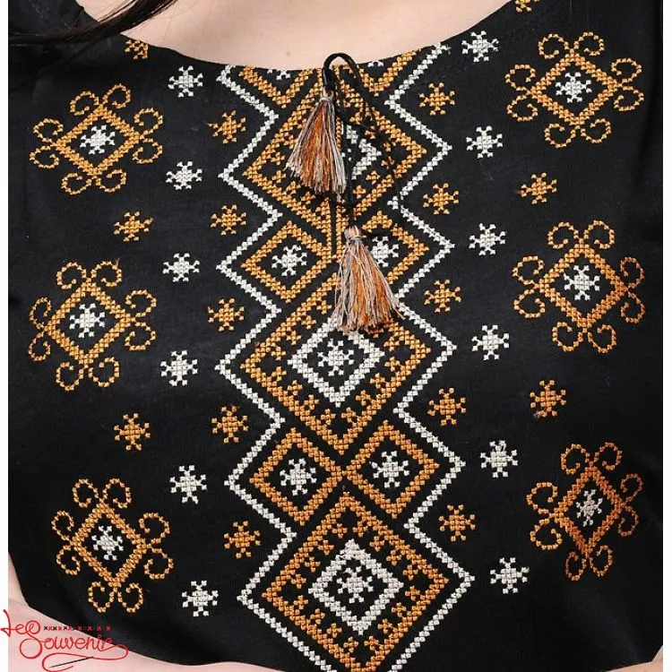 Жіноча вишита футболка оздоблена яскравим широким орнаментом на чорному тлі від гуртівні Leosouvenir чудово підкреслить Ваш неперевершений смак і стиль.