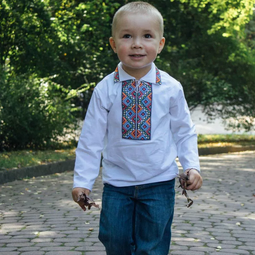 Вишита футболка із різнокольоровою вишивкою з комірчиком від гуртівні Leosouvenir чудово пасуватие Вашому юному Українцю.