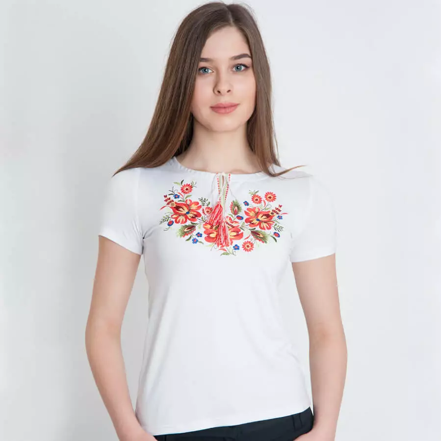 Жіноча вишита футболка оздоблена красивим квітковим візерунком на білому тлі від гуртівні Leosouvenir чудово підкреслить Ваш неперевершений смак і стиль.