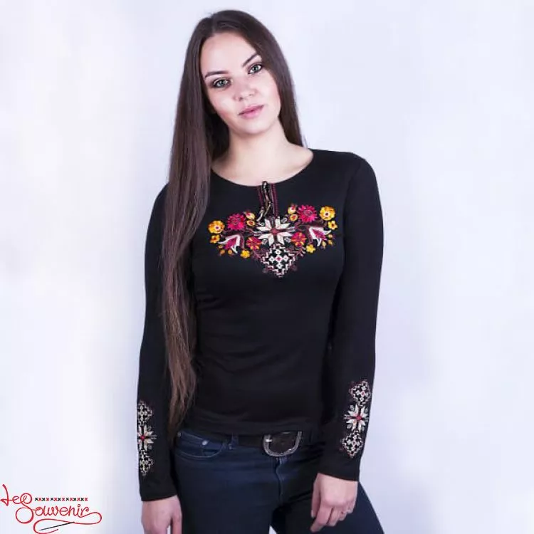 Жіноча вишита футболка оздоблена яскравим квітковим візерунком у теплих тонах на чорному тлі від гуртівні Leosouvenir чудово підкреслить Ваш неперевершений смак і стиль.