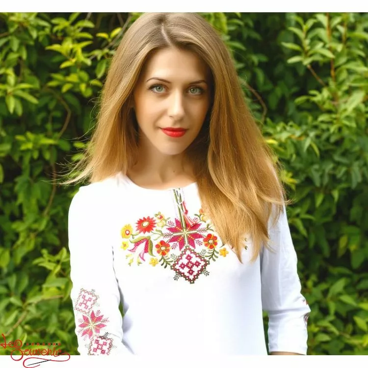 Жіноча вишита футболка оздоблена яскравою квітковою вишивкою хрестиком на білому тлі від гуртівні Leosouvenir чудово підкреслить Ваш неперевершений смак і стиль.