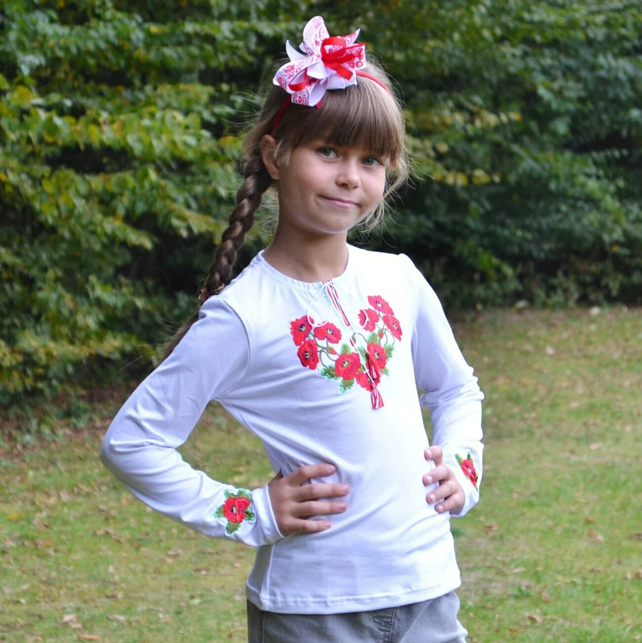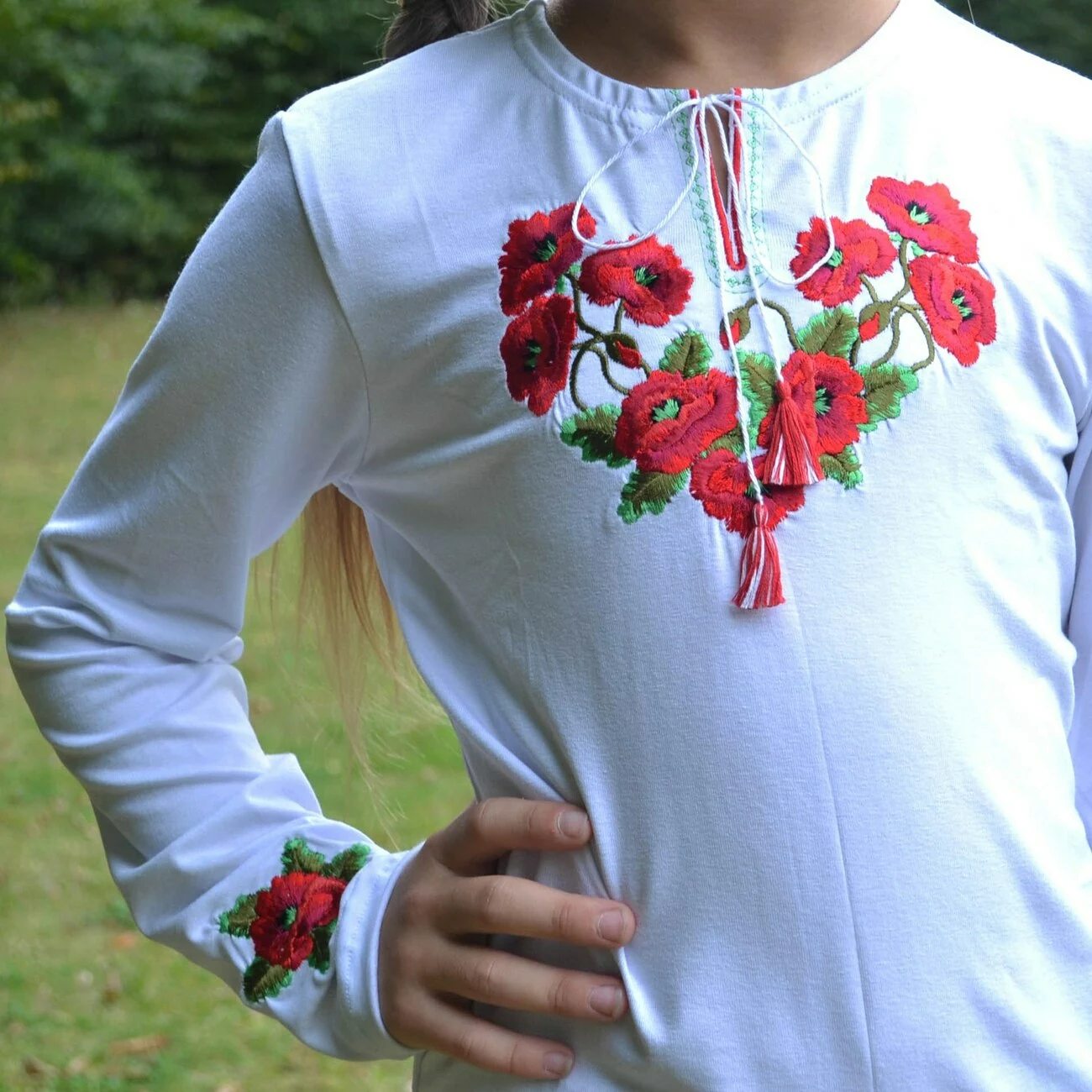 Вишита футболка із яскраво вишивкою на білому тлі від гуртівні Leosouvenir чудово пасуватие Вашій юній Україночці.