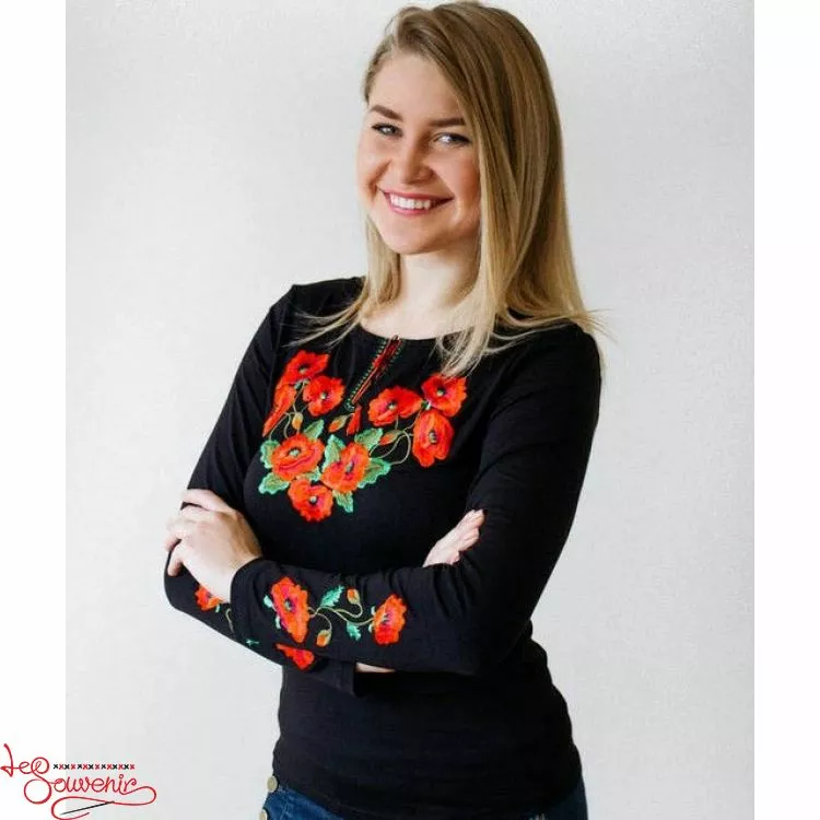Жіноча вишита футболка оздоблена яскравою композицією з червоних маків на чорному тлі від гуртівні Leosouvenir чудово підкреслить Ваш неперевершений смак і стиль.