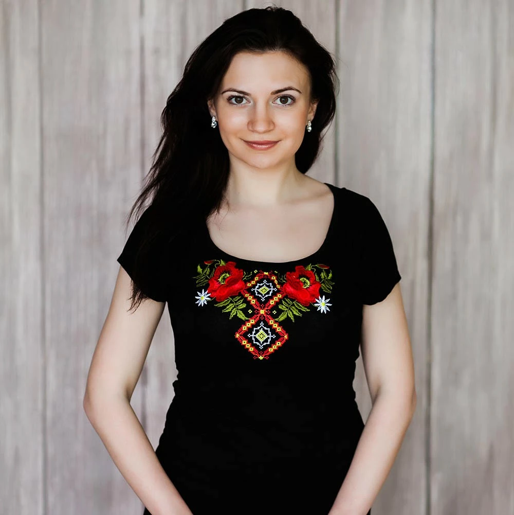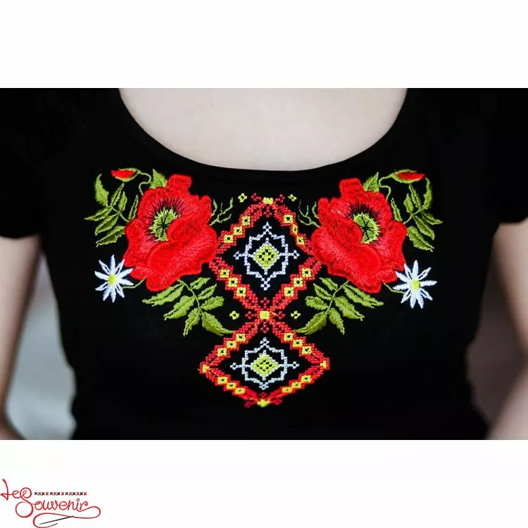 Жіноча вишита футболка оздоблена яскравими маками та червоними ромбами посередині на чорному тлі від гуртівні Leosouvenir чудово підкреслить Ваш неперевершений смак і стиль.