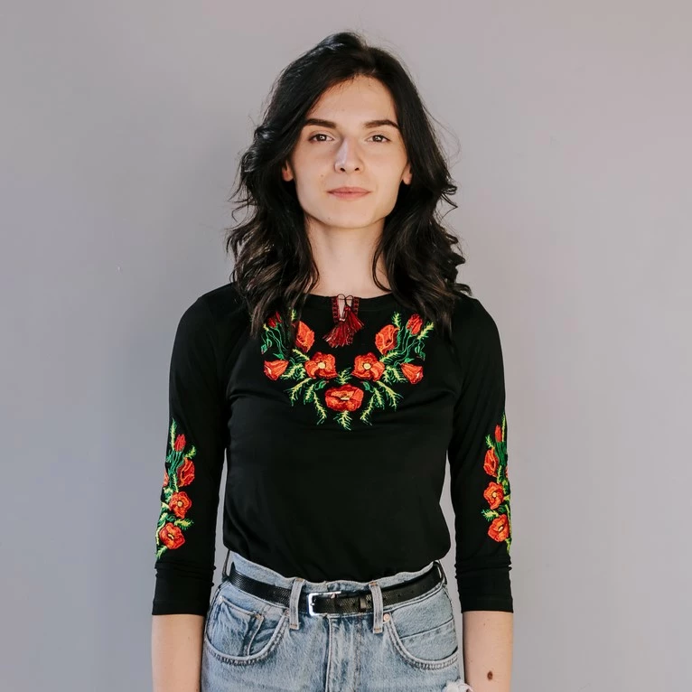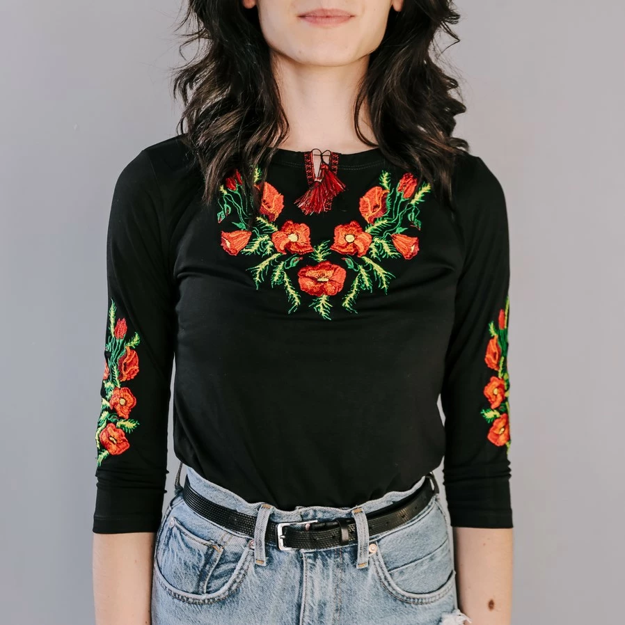 Жіноча вишита футболка оздоблена польовим яскраво-червоними маками на чорному тлі від гуртівні Leosouvenir чудово підкреслить Ваш неперевершений смак і стиль.