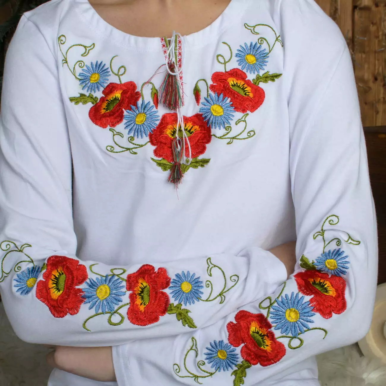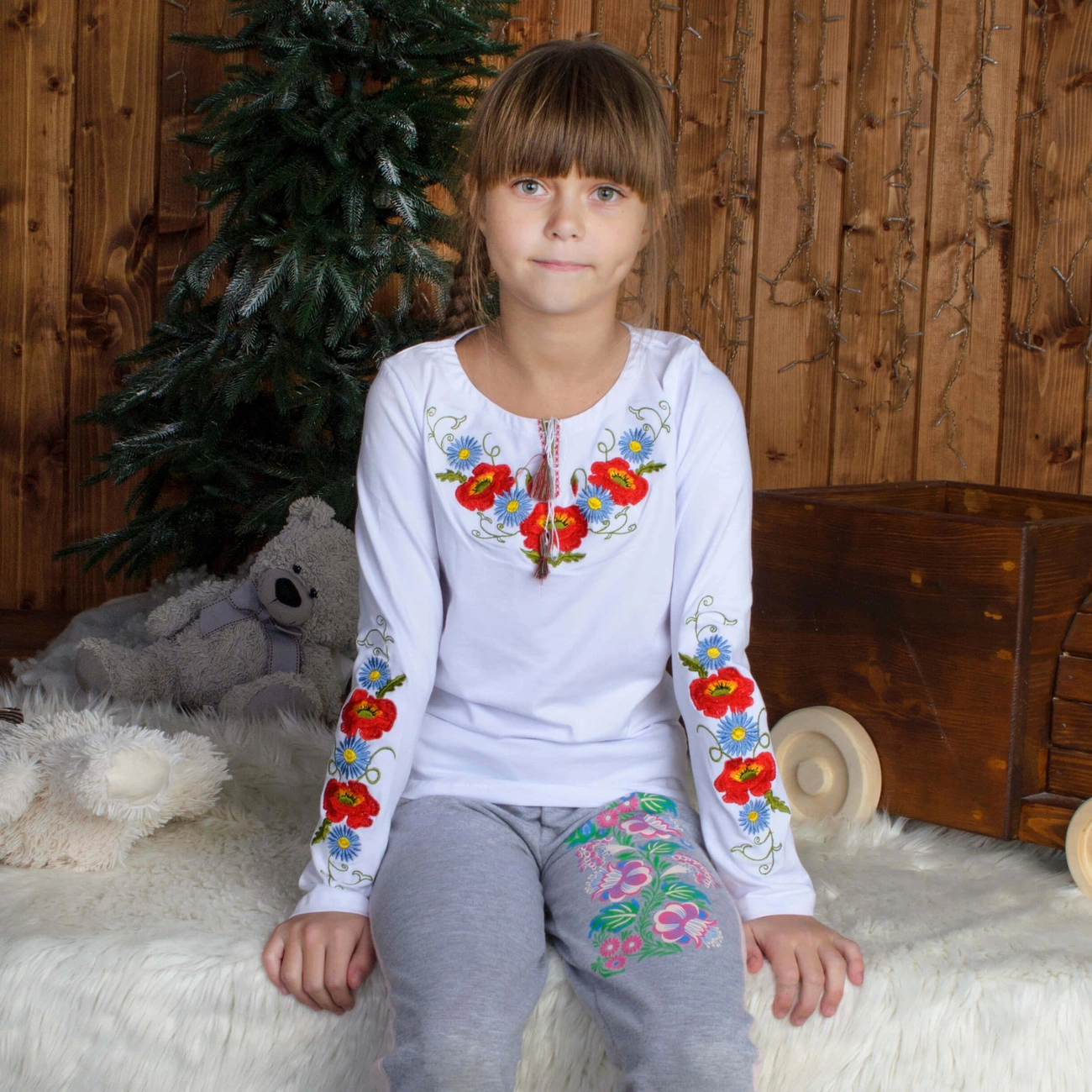Вишита футболка із яскраво-кольоровою вишивкою на білому тлі від гуртівні Leosouvenir чудово пасуватие Вашій юній Україночці.