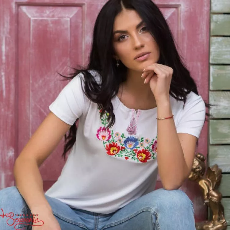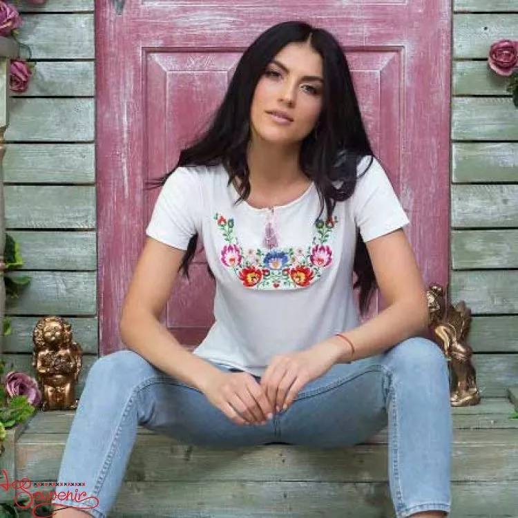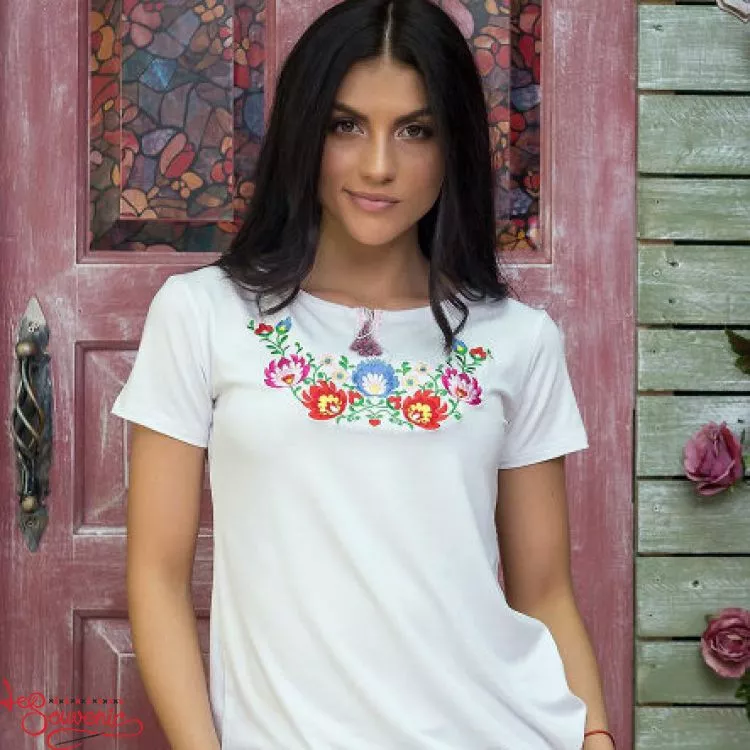 Жіноча вишита футболка оздоблена яскравою квітковою вишивкою гладдю на білому тлі від гуртівні Leosouvenir чудово підкреслить Ваш неперевершений смак і стиль.