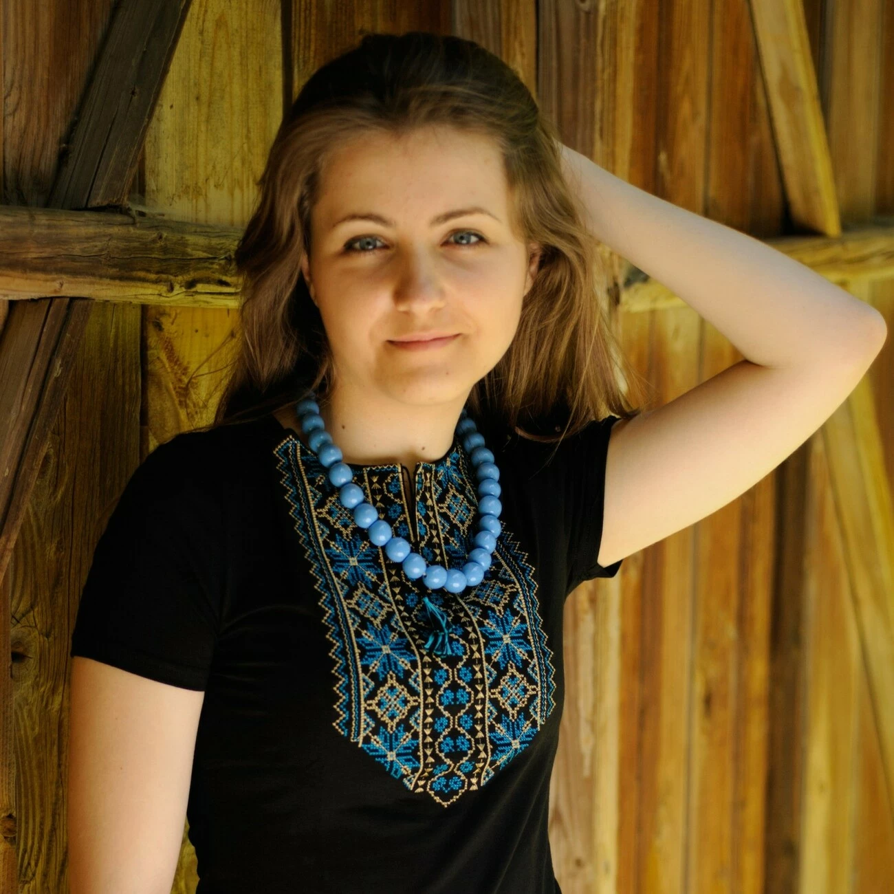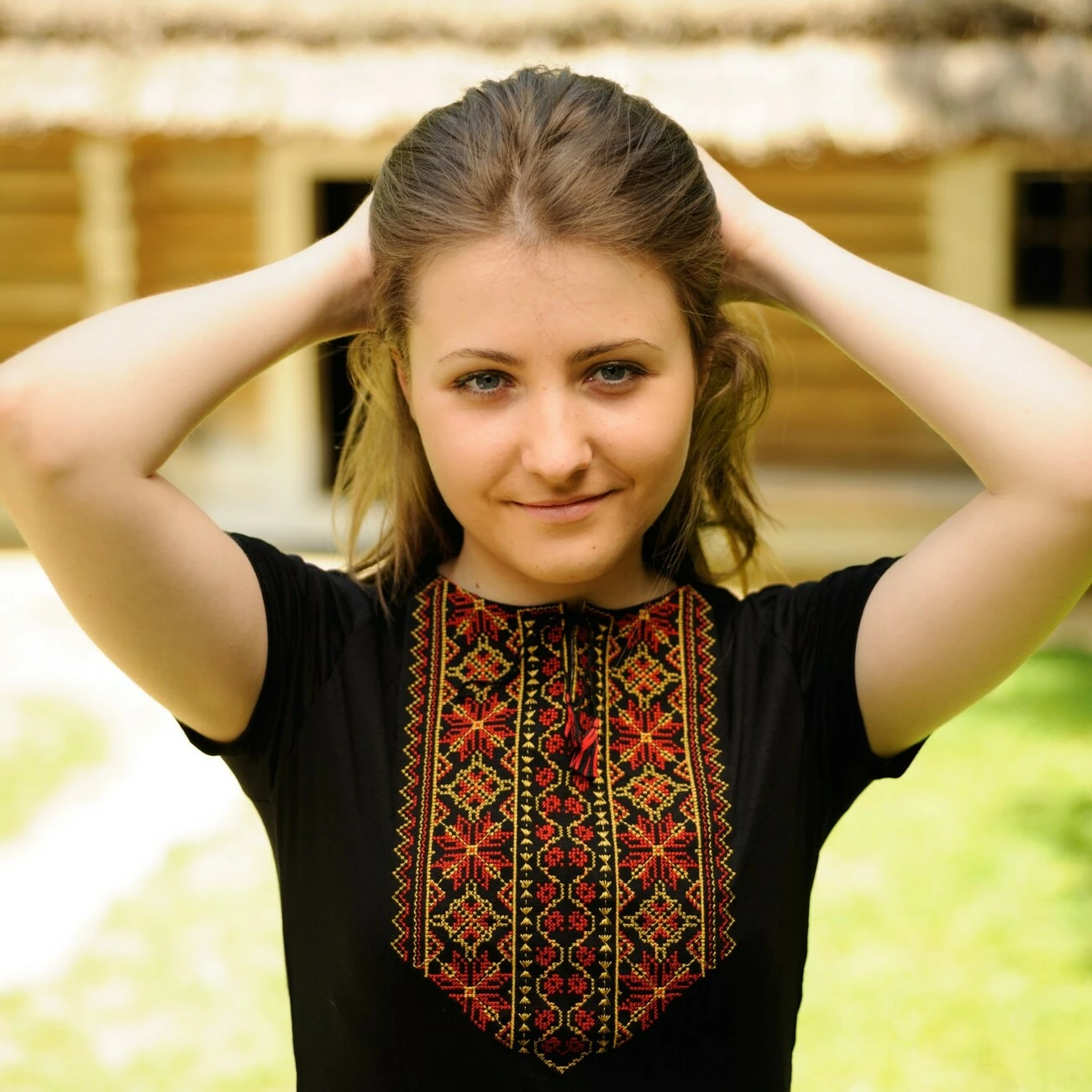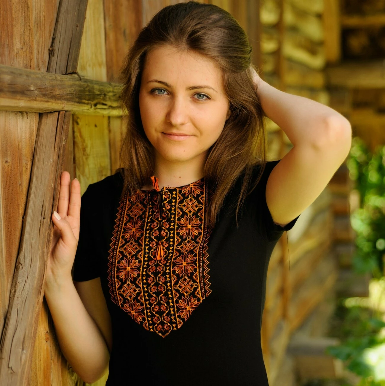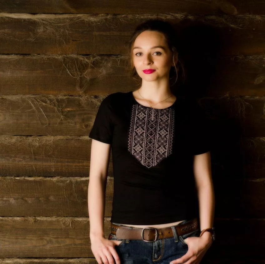 Жіноча вишита футболка оздоблена широкою геометричною вишивкою на чорному тлі від гуртівні Leosouvenir чудово підкреслить Ваш неперевершений смак і стиль.