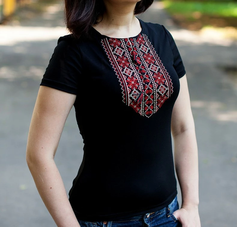 Жіноча вишита футболка оздоблена широкою геометричною вишивкою на чорному тлі від гуртівні Leosouvenir чудово підкреслить Ваш неперевершений смак і стиль.
