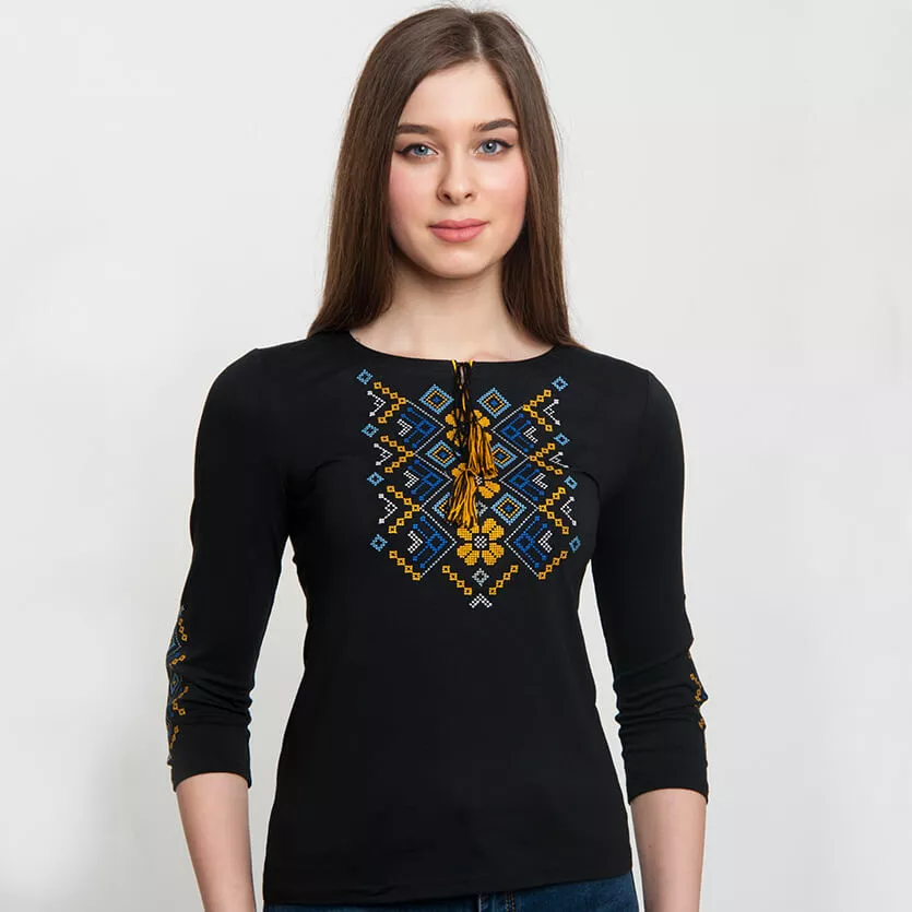 Жіноча вишита футболка оздоблена яскравим візерунком на чорному тлі від гуртівні Leosouvenir чудово підкреслить Ваш неперевершений смак і стиль.