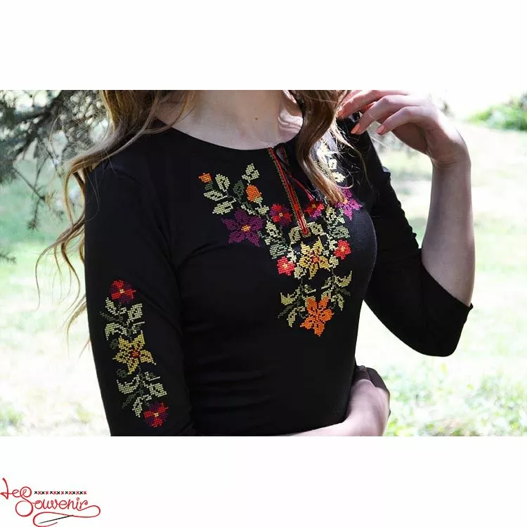 Жіноча вишита футболка оздоблена яскравим квітковим візерунком у теплих тонах на чорному тлі від гуртівні Leosouvenir чудово підкреслить Ваш неперевершений смак і стиль.