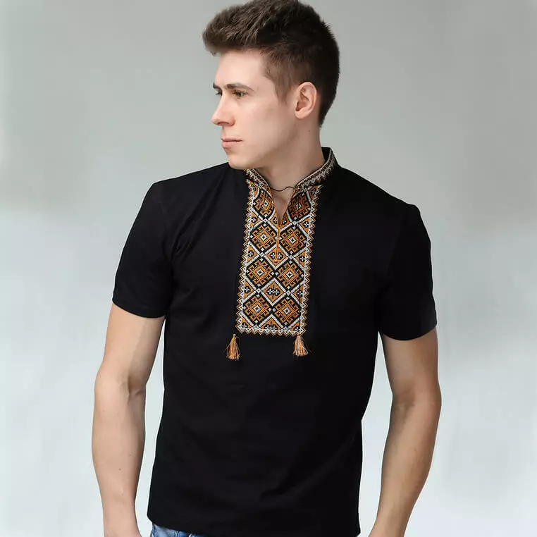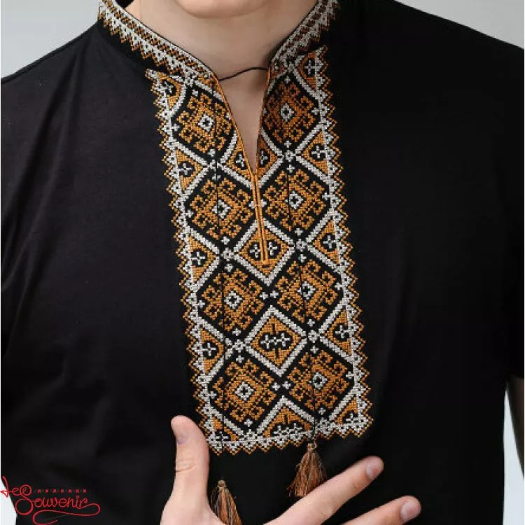 Чоловіча вишита футболка оздоблена вишивкою коричневого кольору на чорному тлі від гуртівні Leosouvenir чудово підкреслить Ваш неперевершений смак і стиль.