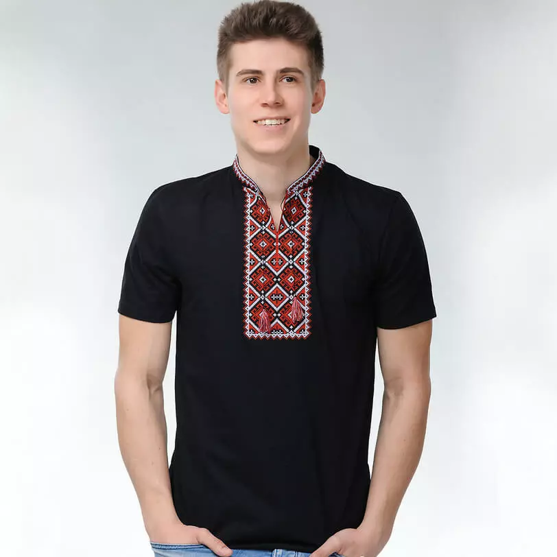 Чоловіча вишита футболка оздоблена вишивкою сіро-червоного кольору на чорному тлі від гуртівні Leosouvenir чудово підкреслить Ваш неперевершений смак і стиль.
