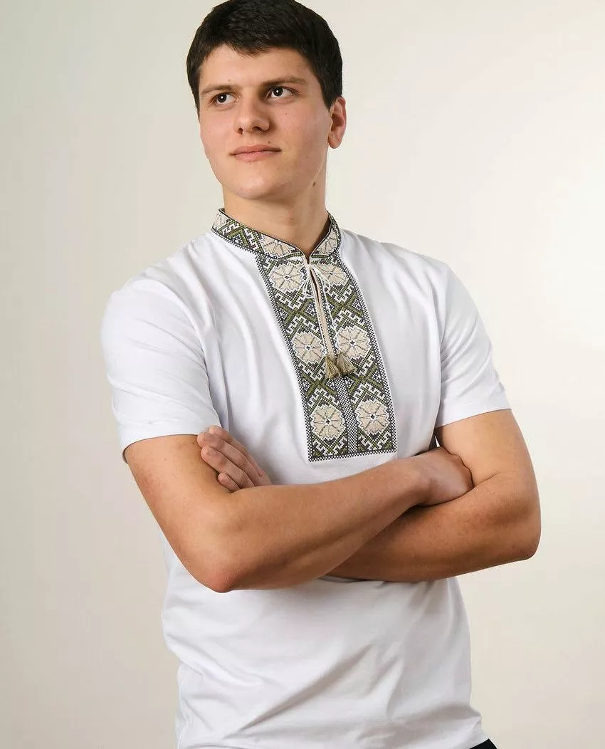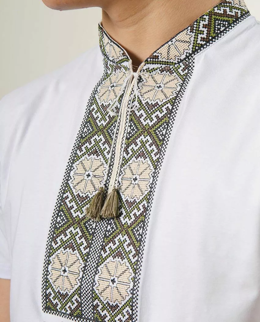 Чоловіча вишита футболка оздоблена вишивкою яскравих кольору на білому тлі від гуртівні Leosouvenir чудово підкреслить Ваш неперевершений смак і стиль.