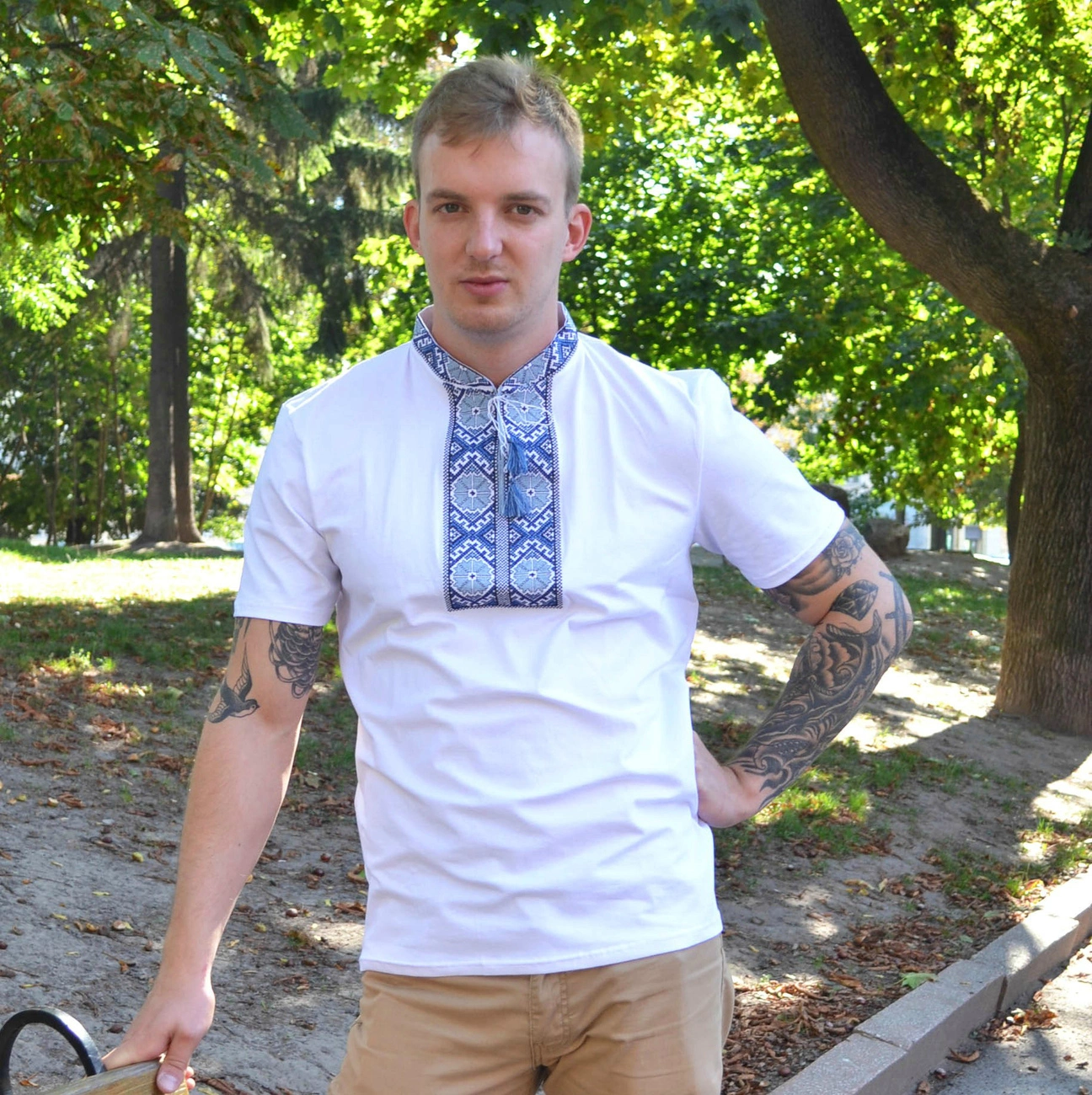 Чоловіча вишита футболка оздоблена вишивкою яскравих кольору на білому тлі від гуртівні Leosouvenir чудово підкреслить Ваш неперевершений смак і стиль.