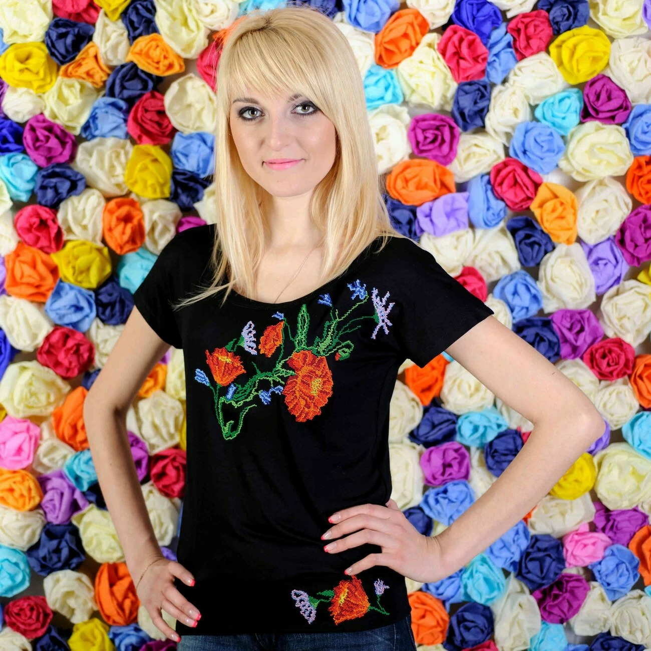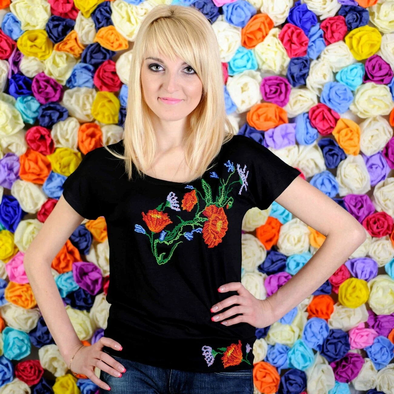 Жіноча вишита футболка оздоблена ніжними польовими квітами на чорному тлі від гуртівні Leosouvenir чудово підкреслить Ваш неперевершений смак і стиль.