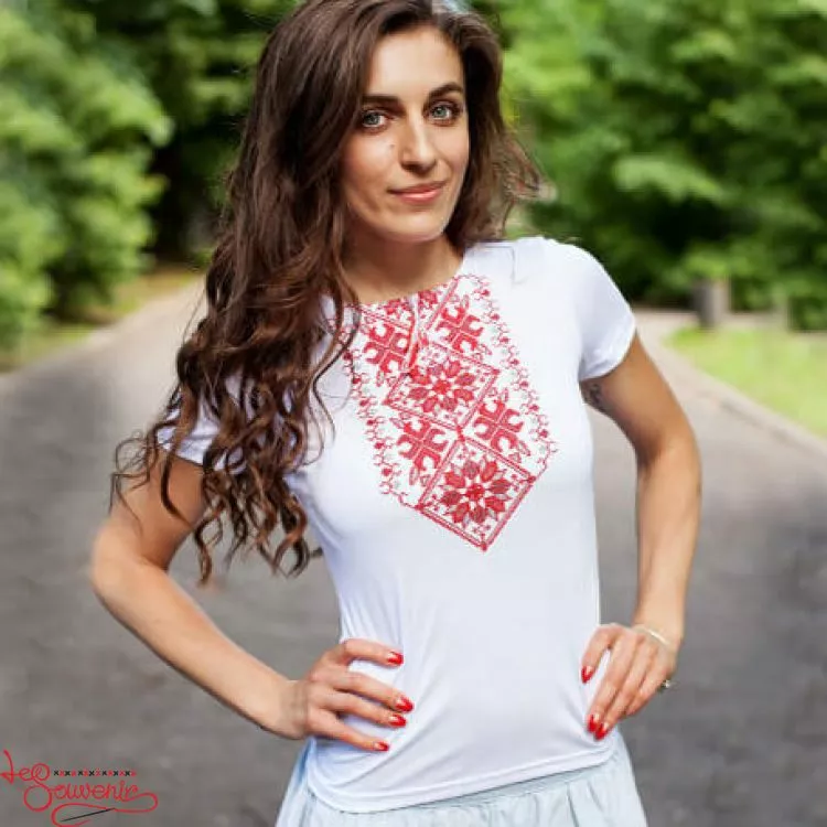 Жіноча вишита футболка оздоблена яскравим оригінальним орнаментом на білому тлі від гуртівні Leosouvenir чудово підкреслить Ваш неперевершений смак і стиль.