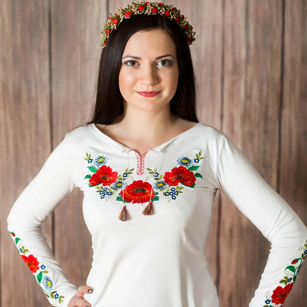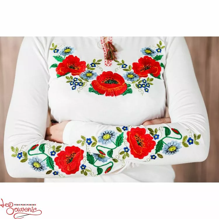Жіноча вишита футболка оздоблена яскравим вишитим букетом квітів на білому тлі від гуртівні Leosouvenir чудово підкреслить Ваш неперевершений смак і стиль.