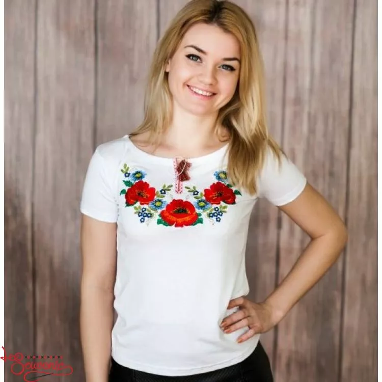 Жіноча вишита футболка оздоблена яскравим широким багатим квітковим візерунком на білому тлі від гуртівні Leosouvenir чудово підкреслить Ваш неперевершений смак і стиль.