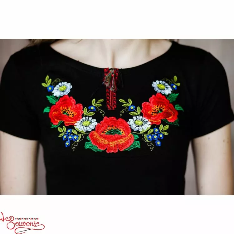 Жіноча вишита футболка оздоблена яскравим широким багатим орнаментом на чорному тлі від гуртівні Leosouvenir чудово підкреслить Ваш неперевершений смак і стиль.