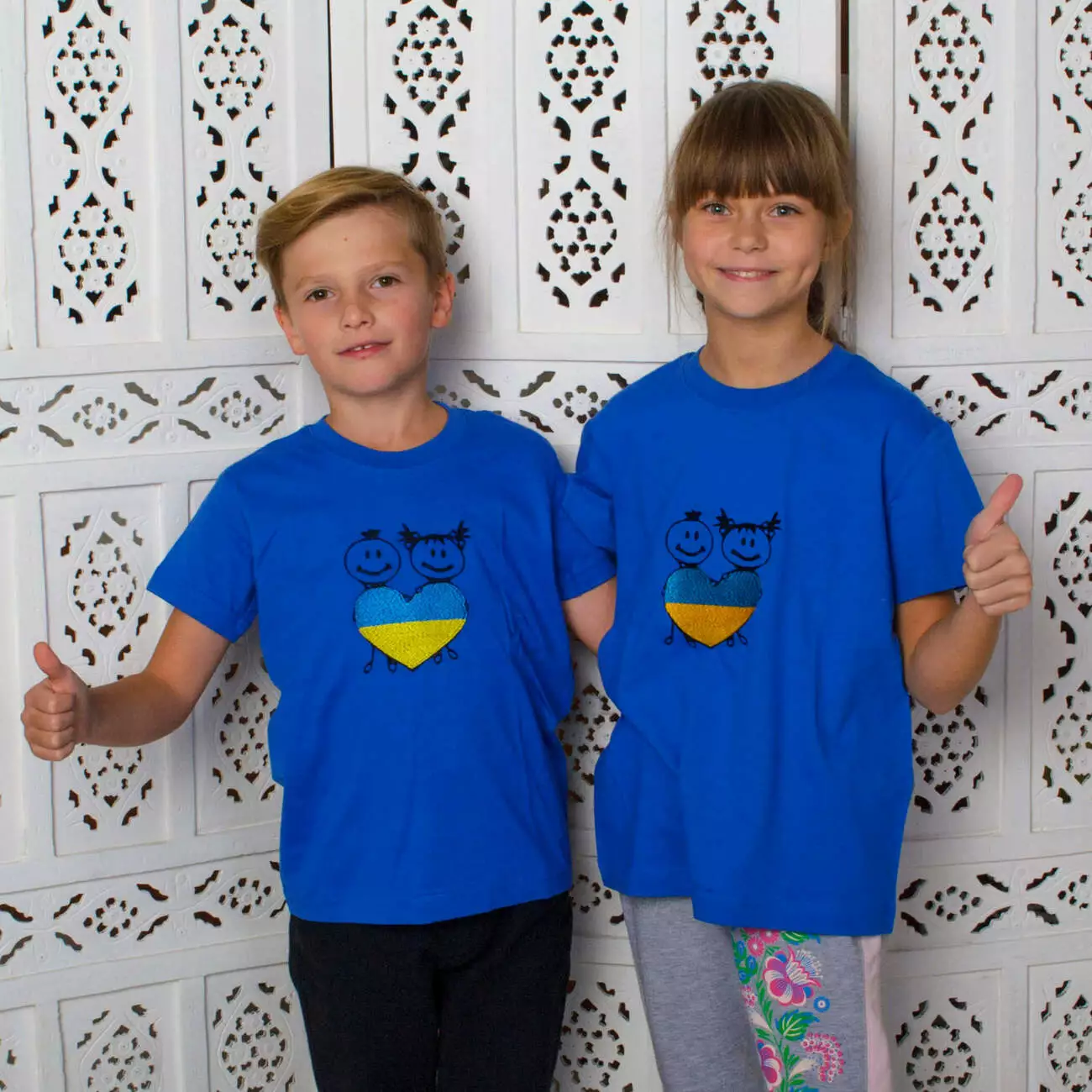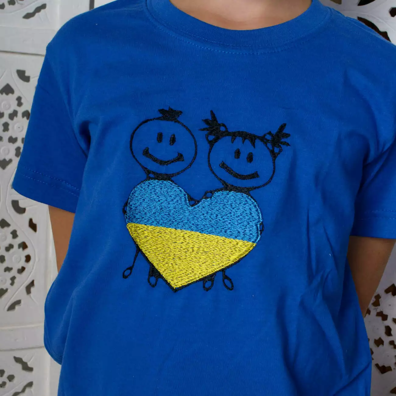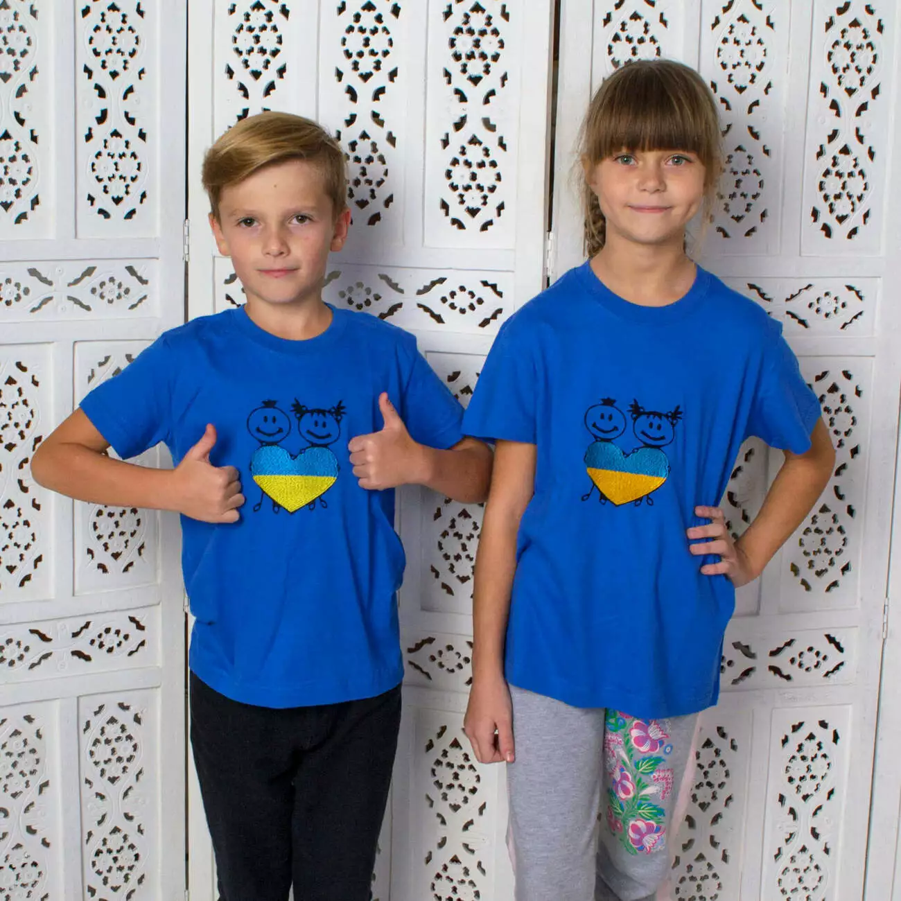 Дитяча футболка із вишитим синьо-жовтим серцем на синьому тлі від гуртівні Leosouvenir чудово пасуватиме Вашій малечі.