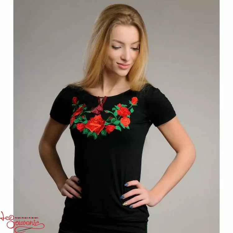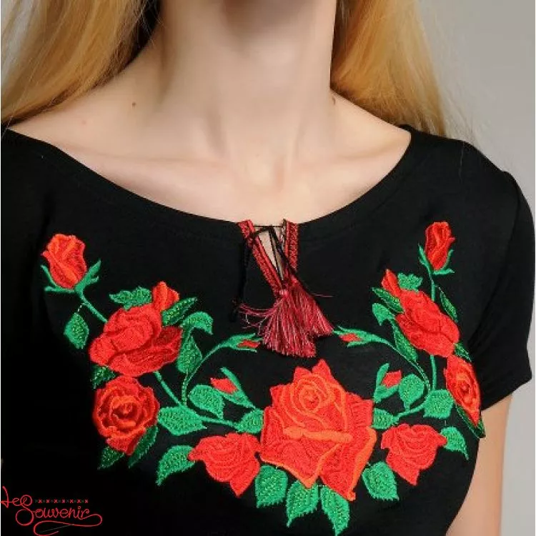 Жіноча вишита футболка оздоблена яскравим широким квітковим орнаментом на чорному тлі від гуртівні Leosouvenir чудово підкреслить Ваш неперевершений смак і стиль.