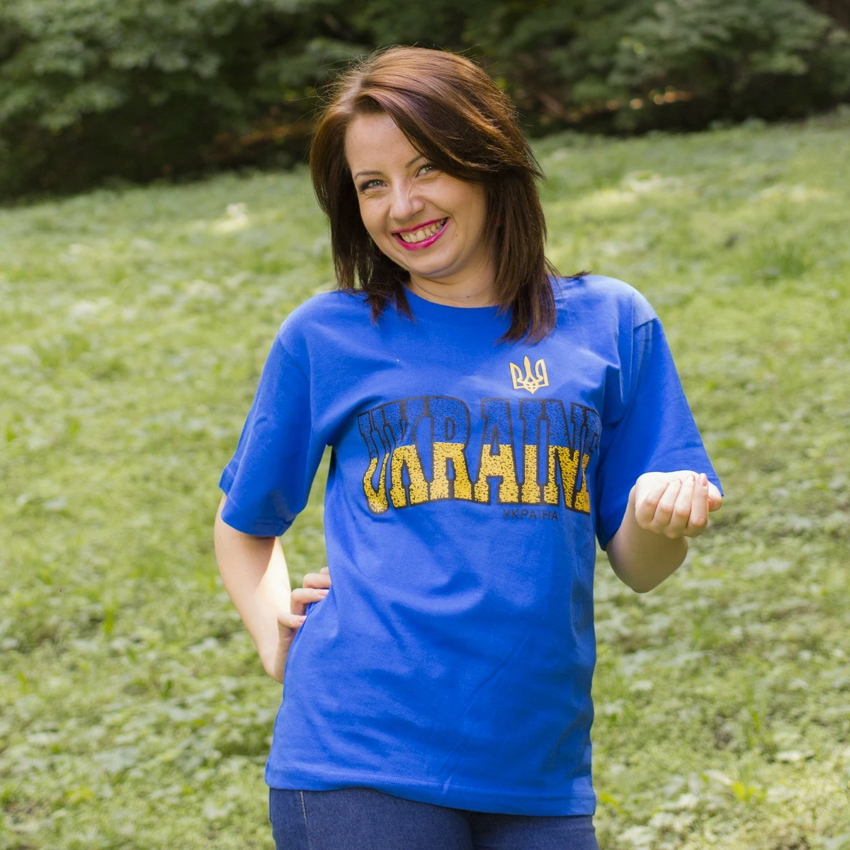 Жіноча футболка із патріотичним принтованим надписом на синьому тлі від гуртівні Leosouvenir зробить Вас неперевершеною Українкою.