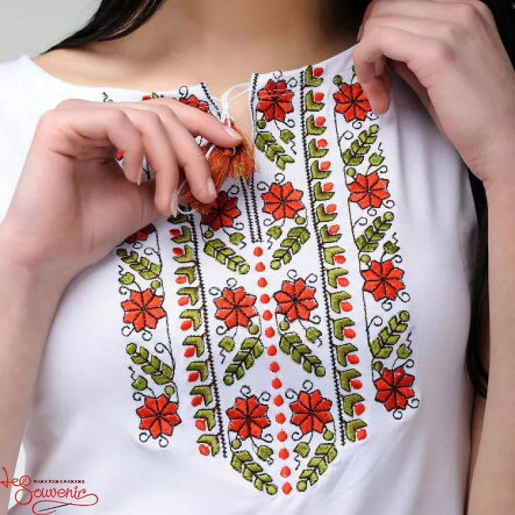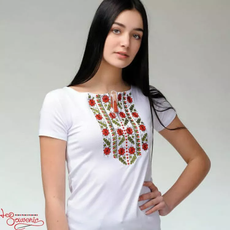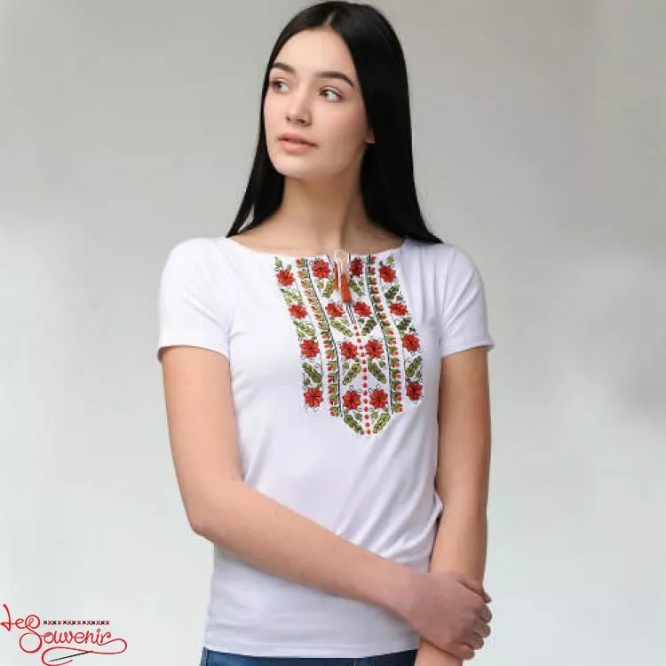 Жіноча вишита футболка оздоблена красивим червоним візерунком на білому тлі від гуртівні Leosouvenir чудово підкреслить Ваш неперевершений смак і стиль.