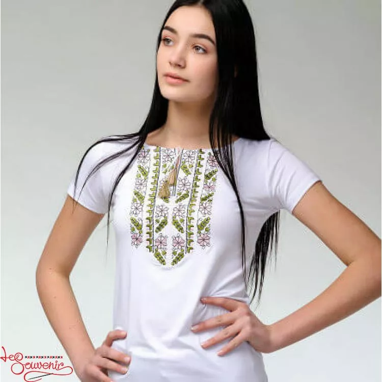 Жіноча вишита футболка оздоблена красивим зелено-рожевим візерунком на білому тлі від гуртівні Leosouvenir чудово підкреслить Ваш неперевершений смак і стиль.