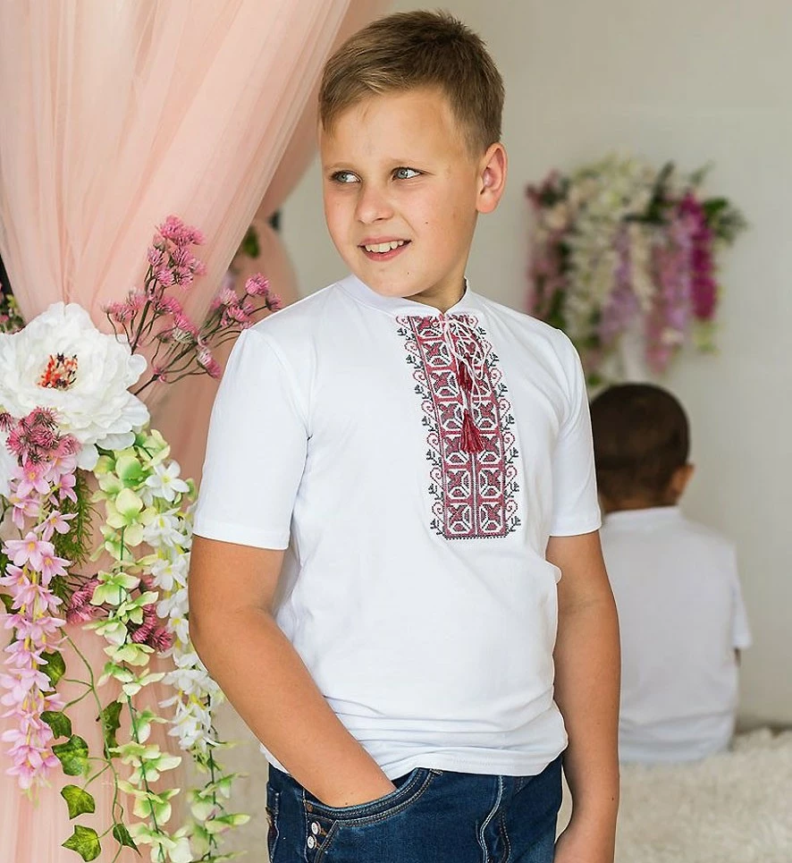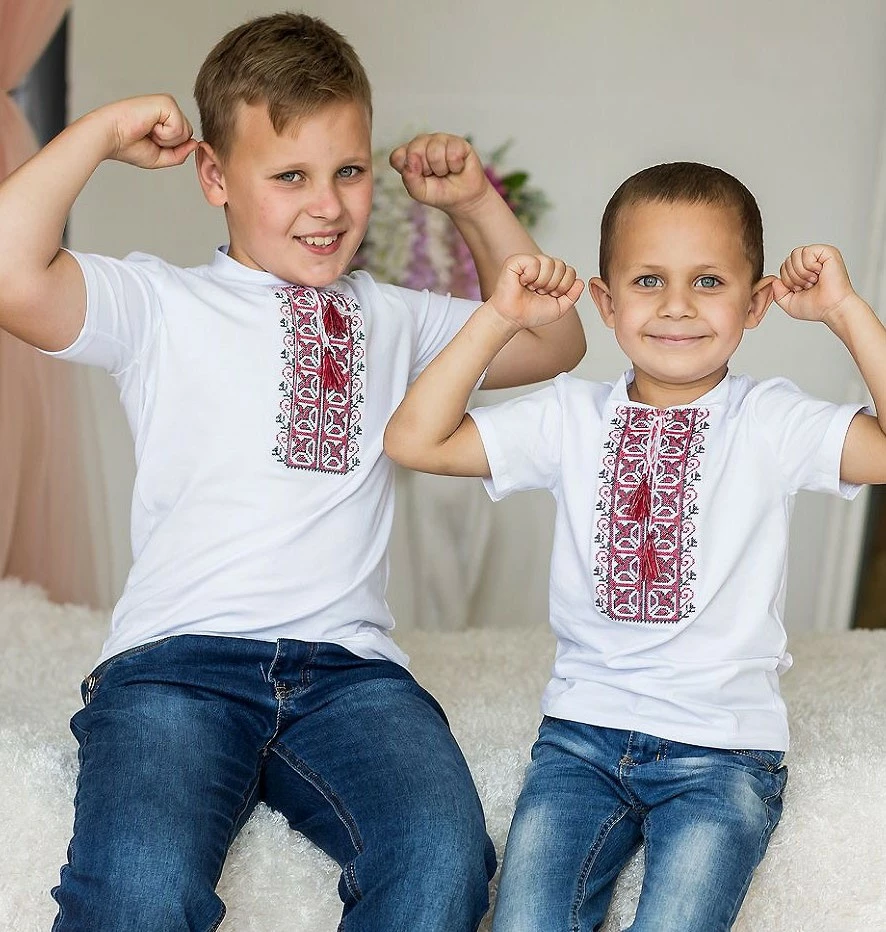 Дитяча вишита футболка із різнокольоровою вишивкою від гуртівні Leosouvenir чудово пасуватие Вашому юному Українцю.