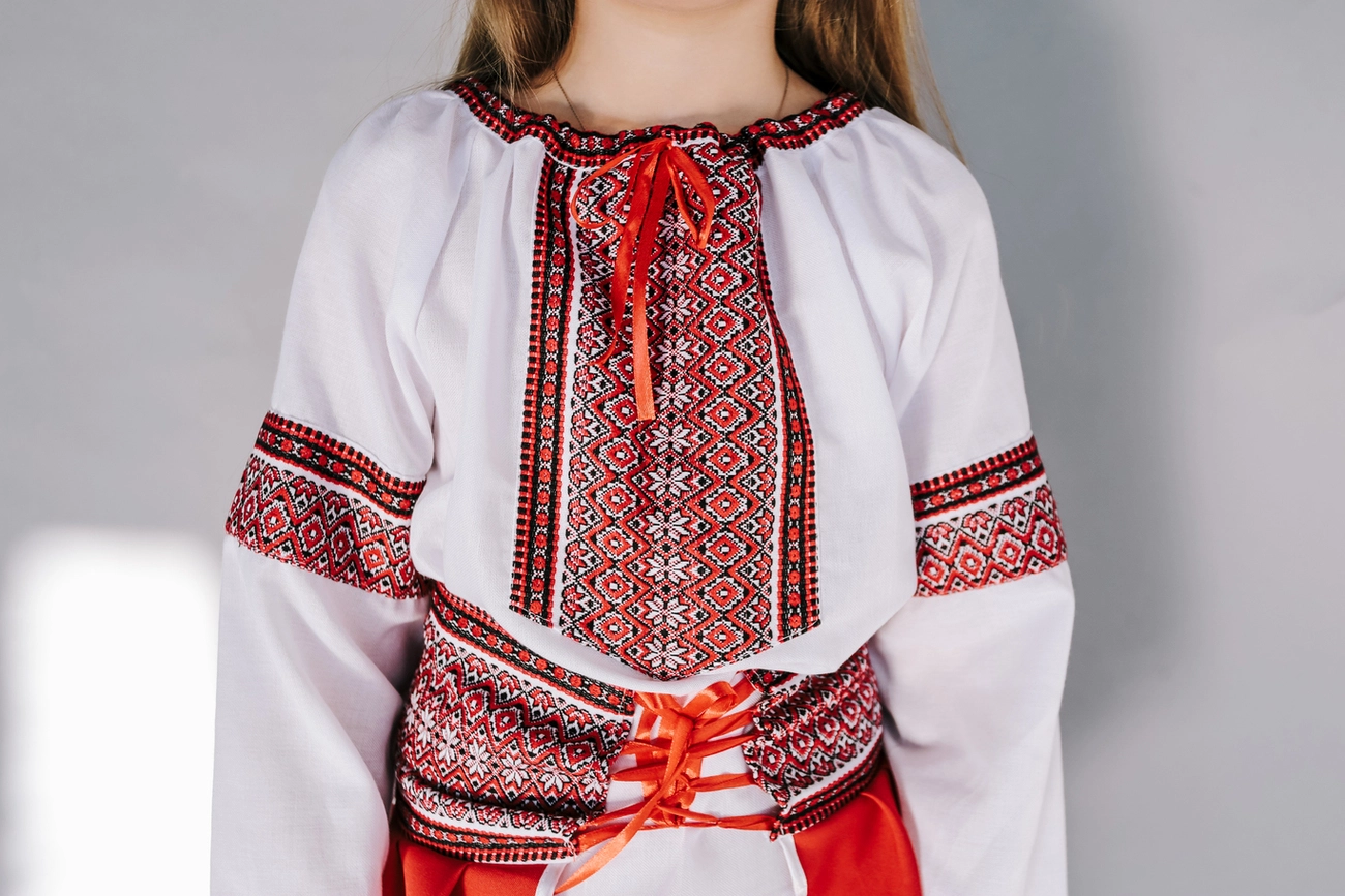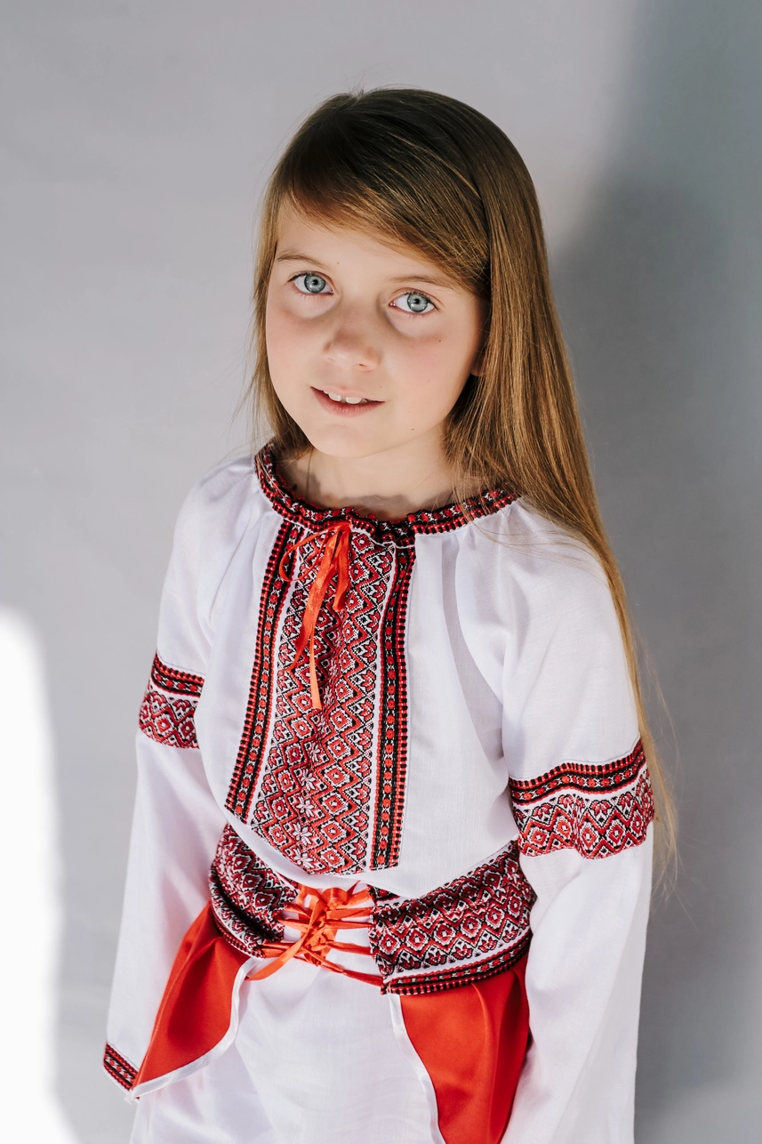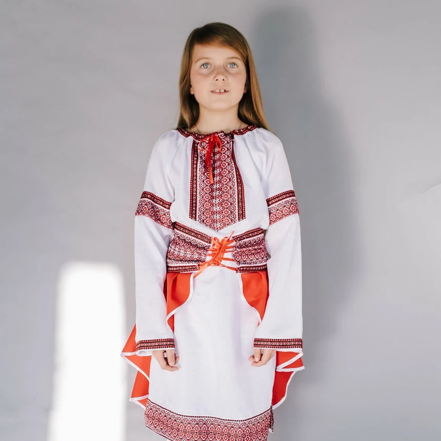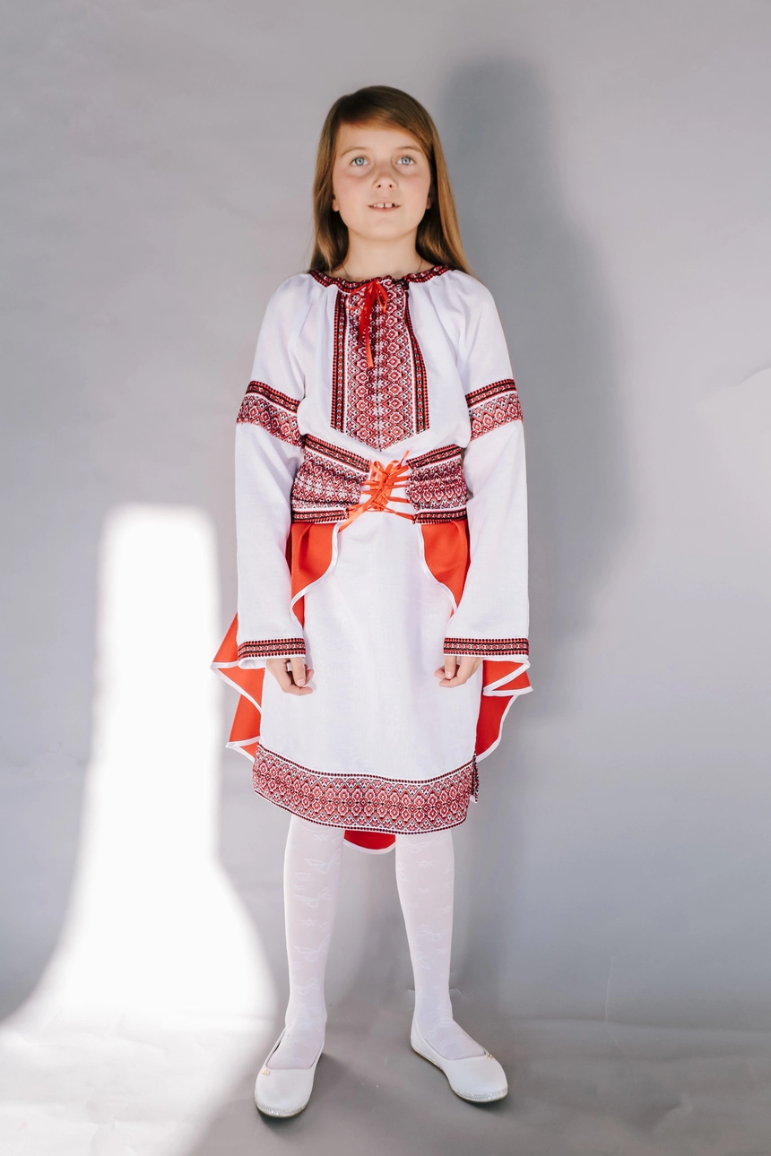 Дитячий вишитий костюм білого кольору із оригінальною червоною спідничкою та вишивкою від гуртівні Leosouvenir створить неперевершений вигляд Вашої дитини.