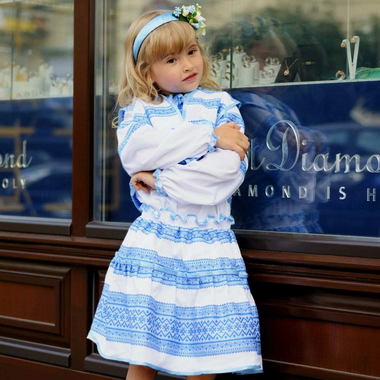 Дитячий вишитий костюм білого кольору із оригінальним синеньким візерунком від гуртівні Leosouvenir створить неперевершений вигляд Вашої дитини.