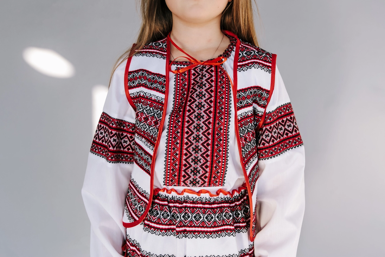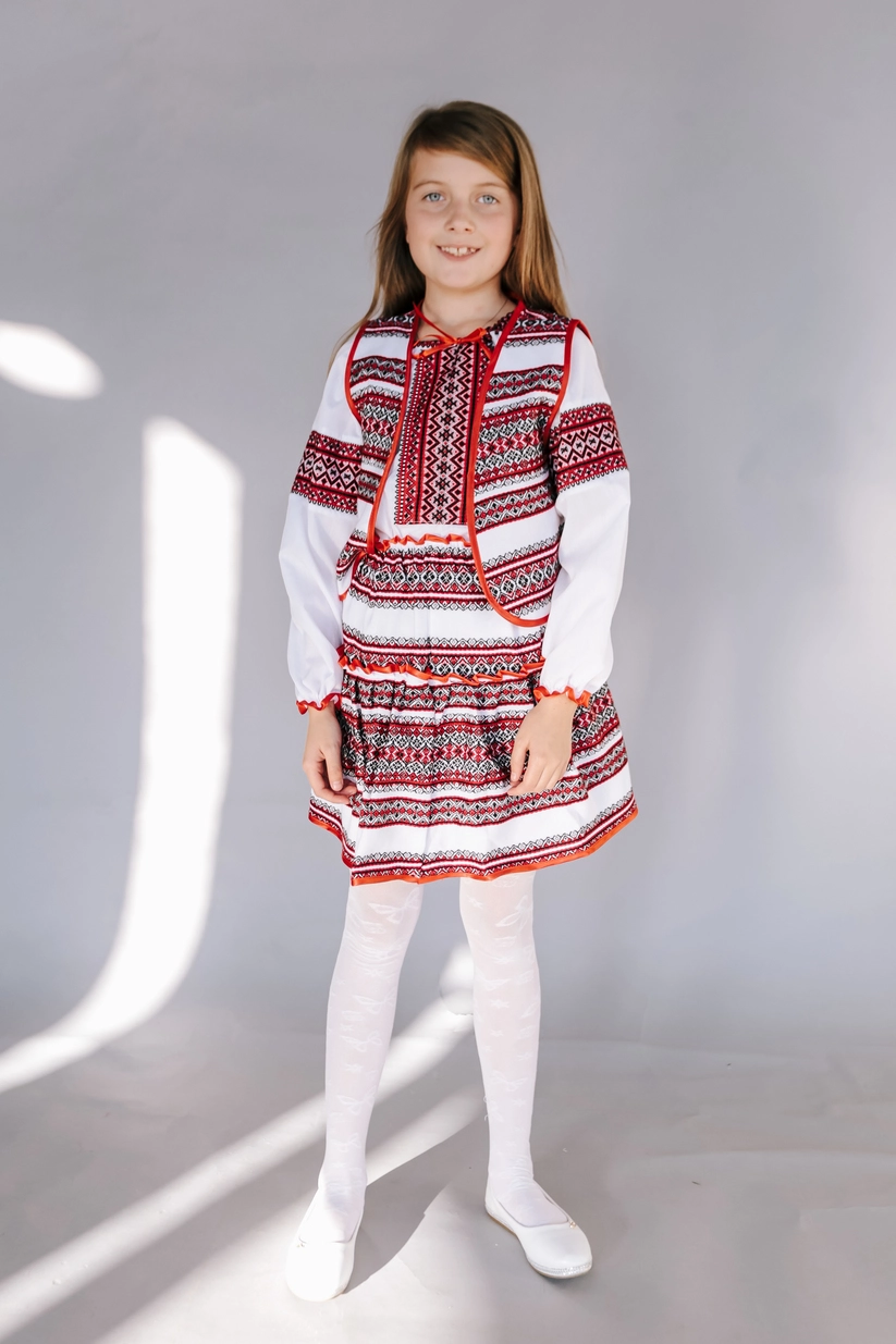 Дитячий вишитий костюм білого кольору із оригінальним червоним візерунком від гуртівні Leosouvenir створить неперевершений вигляд Вашої дитини.